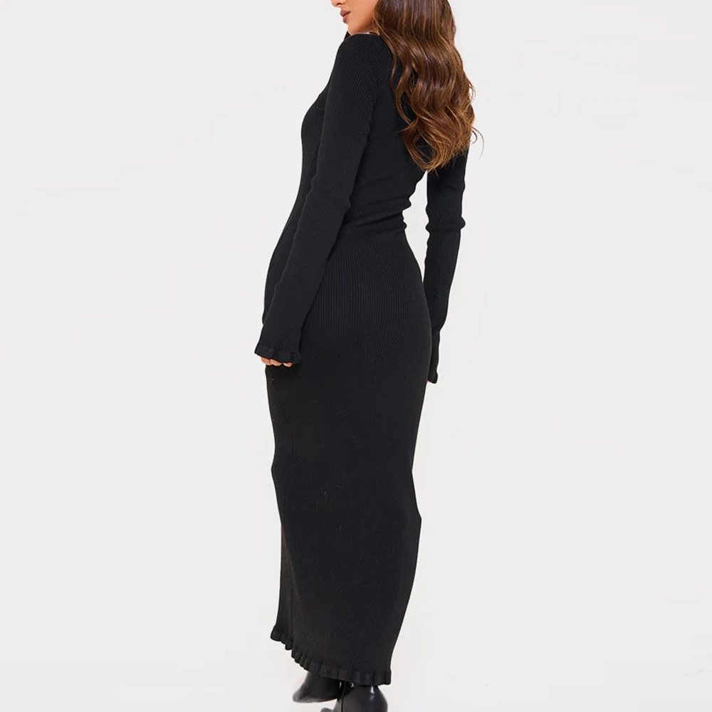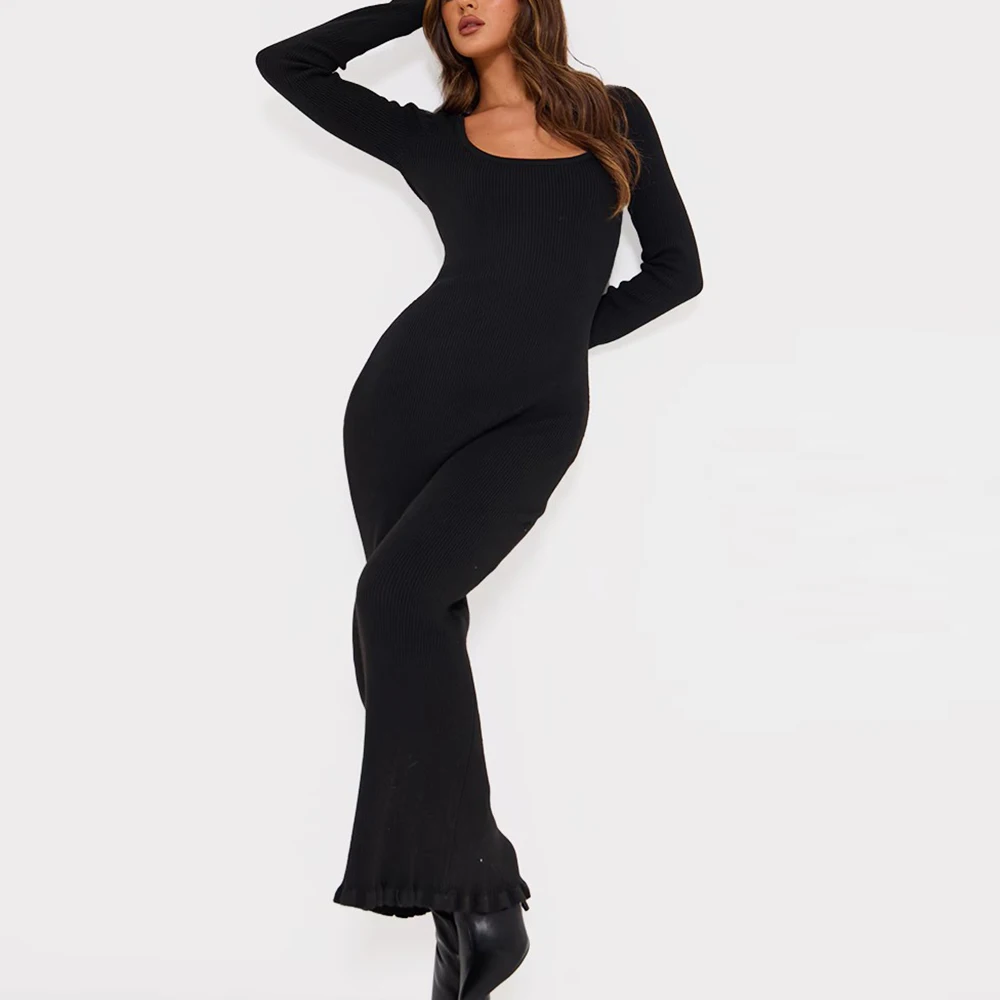 Hot Selling square Neck Women Long Sleeve Rib Knit Dresses Custom Solid Color Slm Fit Ladies Piquet Hem Bodycon Maxi Dress