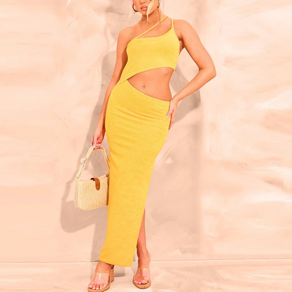 Factory Hot Selling Solid Color Lersey Dresses Custom Asymmetrical Strappy Cut Out Design Sexy Slim Fit Bodycon Midi Dress