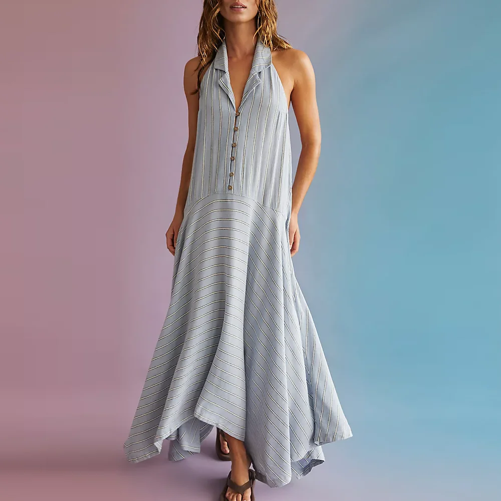 Factory Summer Sleeveless Button up v Neck Dresses Custom Loose Fit Women Backless Asymmetrical Hem Striped Long Maxi Dress