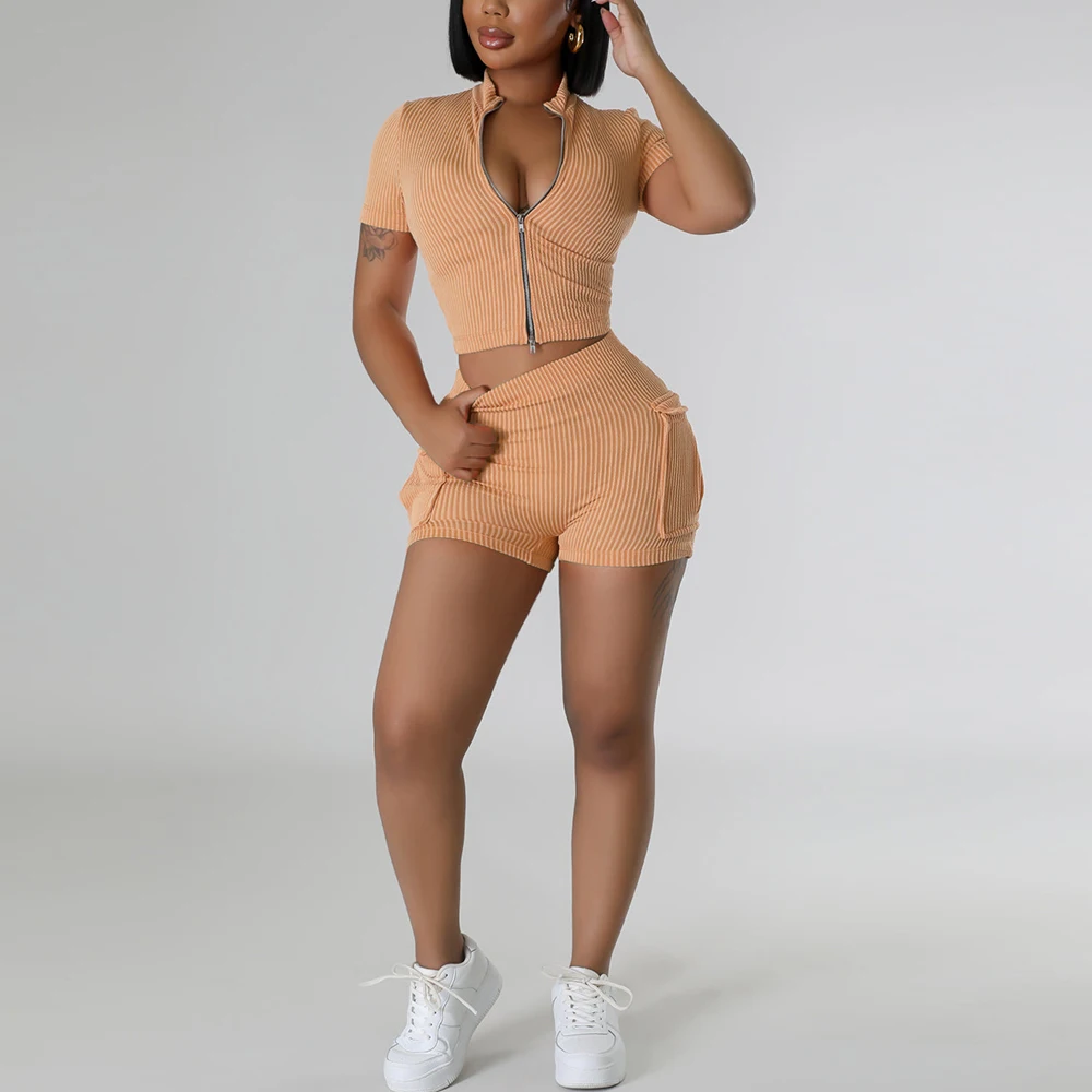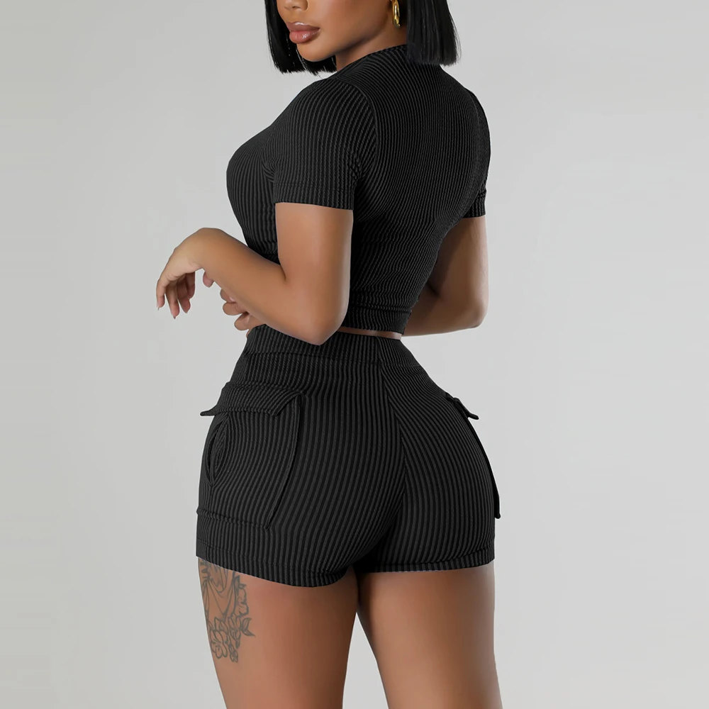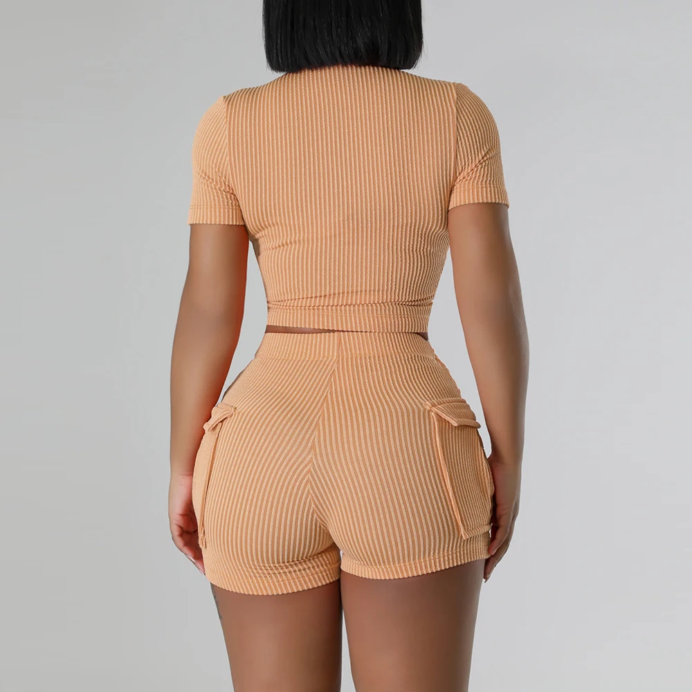 New Design Short Sleeve Workout Fitness Gym Wear Women Slim Fit Custom logo Design Seamless Two Piece Set Modest Sports Sets