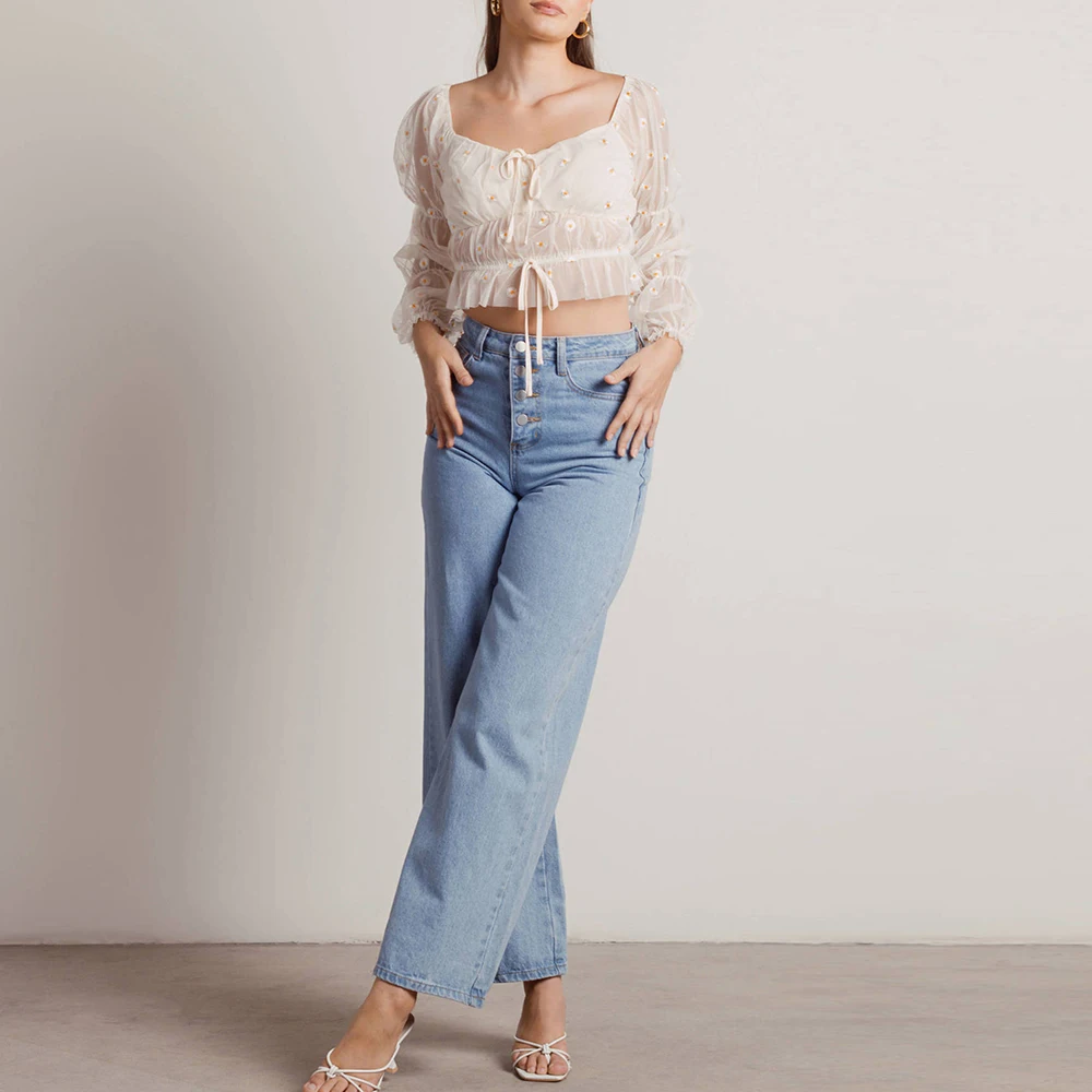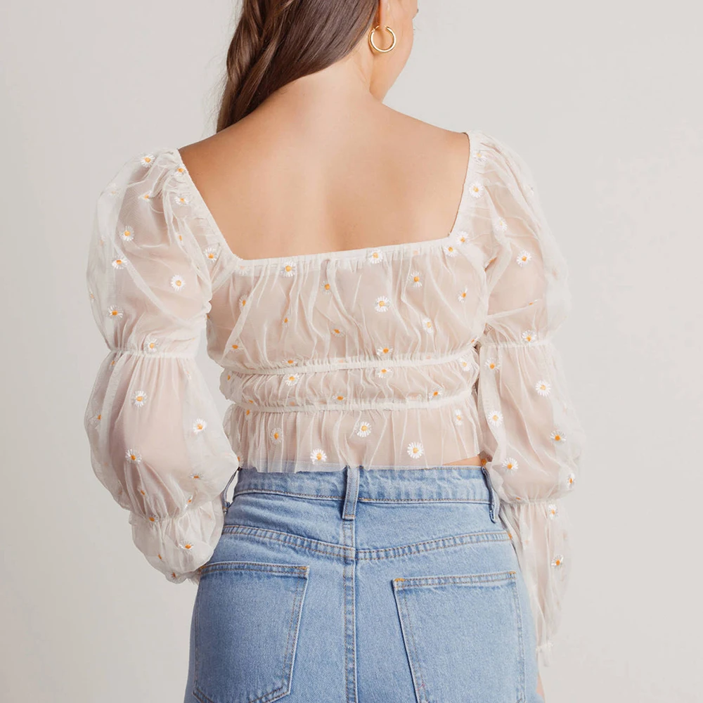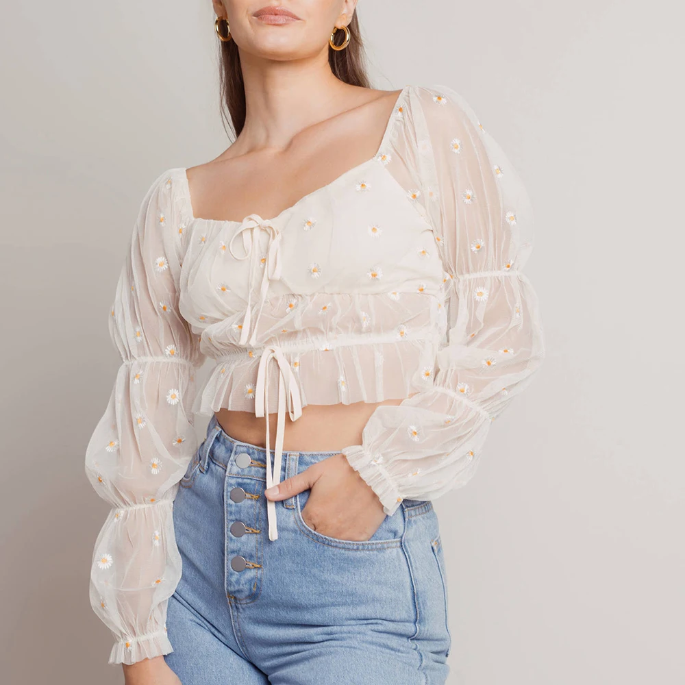 Suppliers Oem Wholesale square Neck Crop Tops Women Blouse Custom Floral Embroidered Pull Long Sleeve Crop Tops for Girls