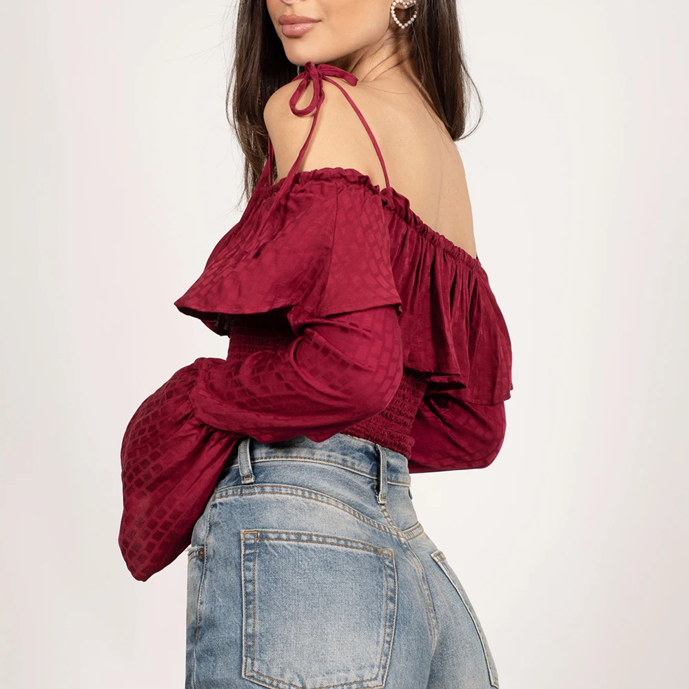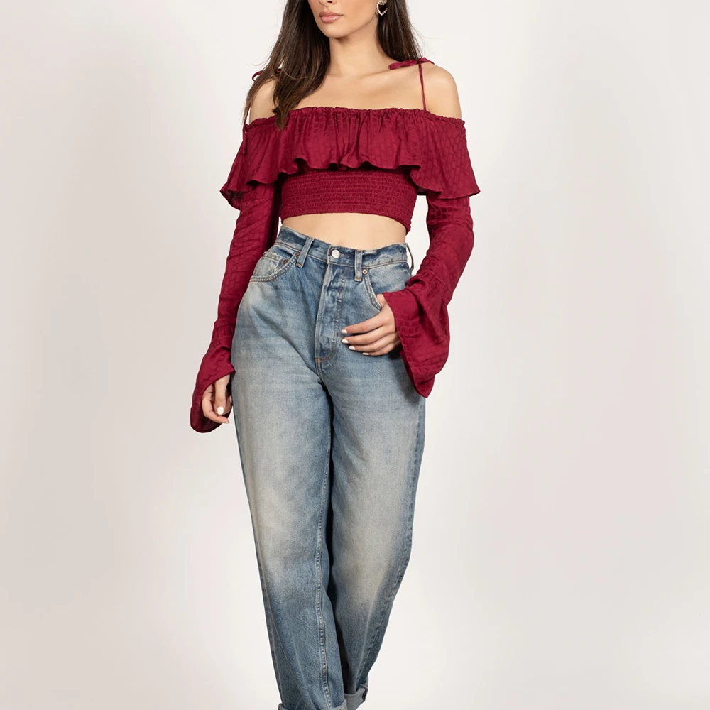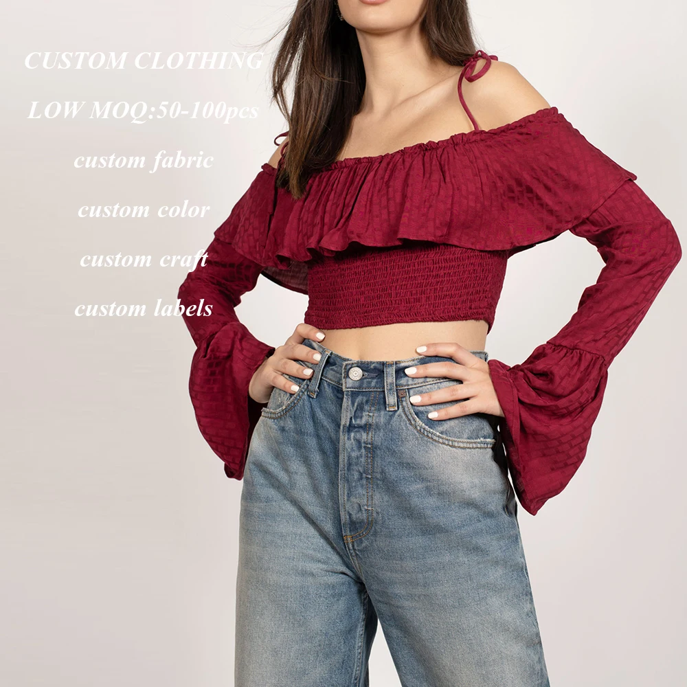 Factory Oem Wholesale Long Sleeve Crop Top Women Custom off Shoulder Ruffled Design Blouses Bell Sleeve Shirred Women Tops