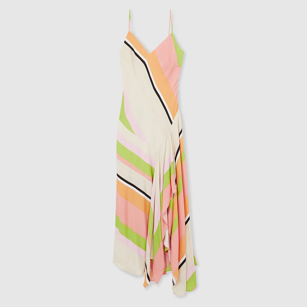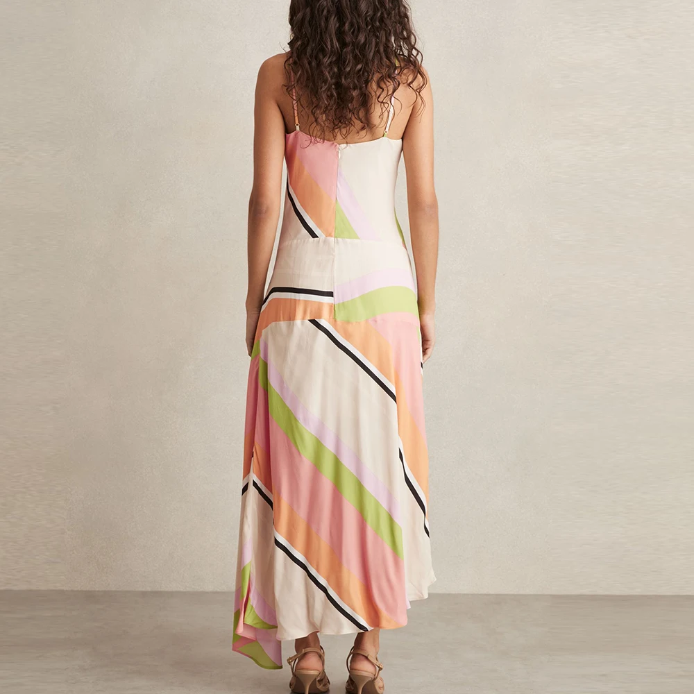 2026 Summer Hot Selling Colorful Striped Long Dresses Custom Asymmetrical Hem Women Spaghetti Straps Sleeveless Maxi Dress