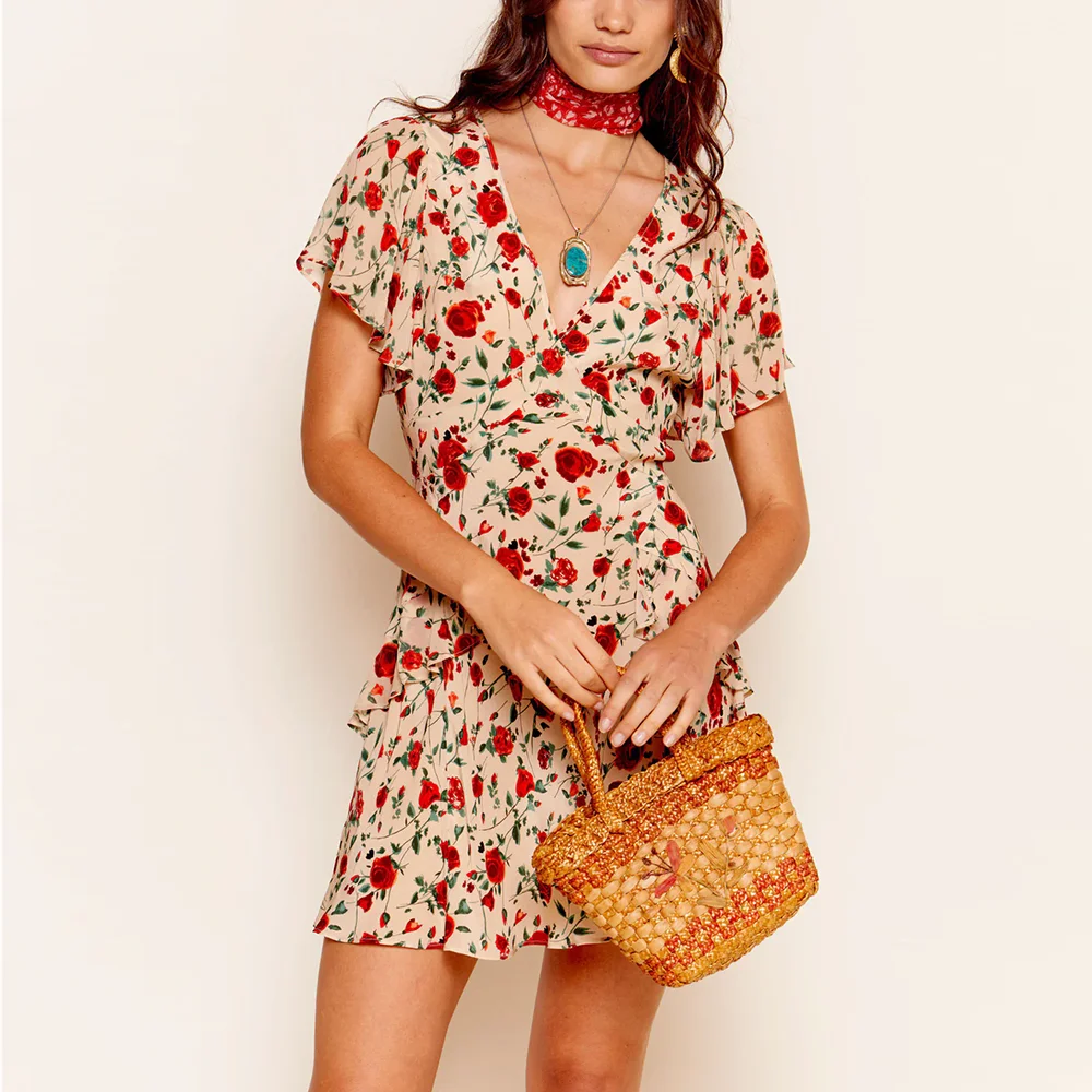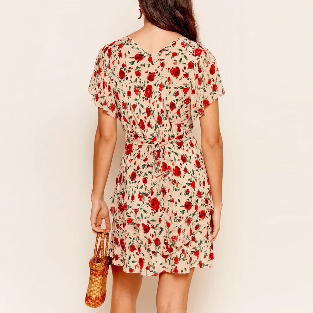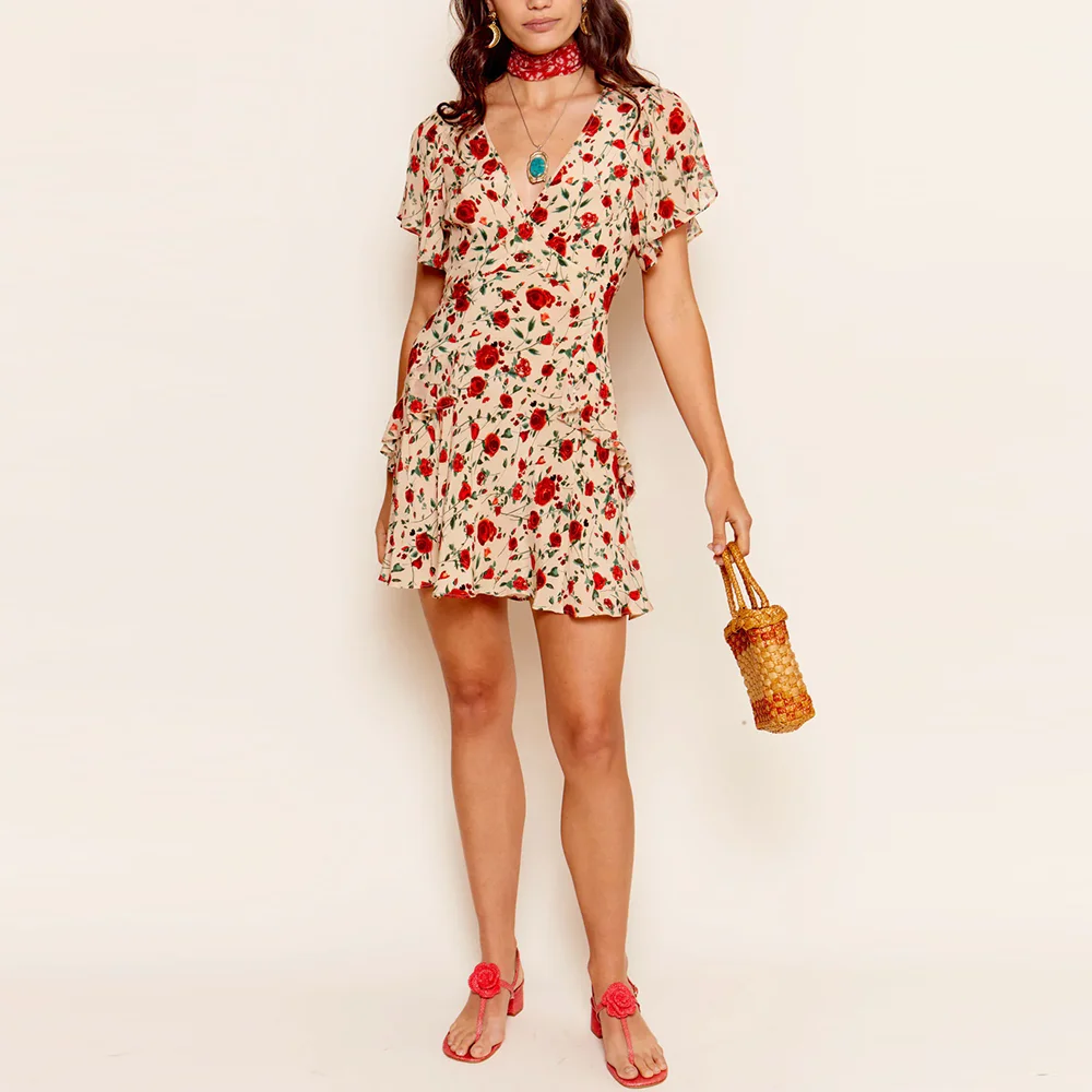 Manufacturer Oem Summer Women v Neck Short Sleeve Dresses Custom Ruffled Trims Women Sweet Floral Printed Chiffon Mini Dress