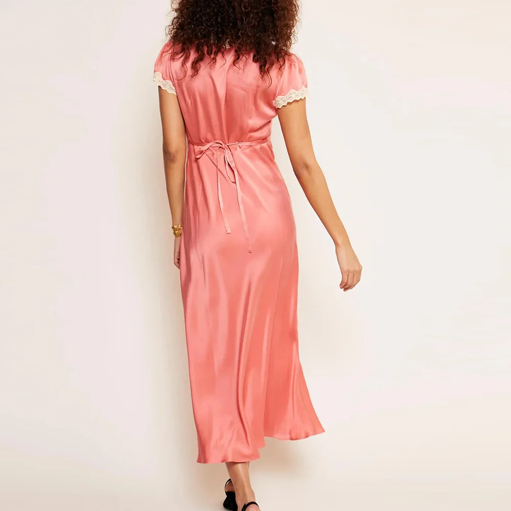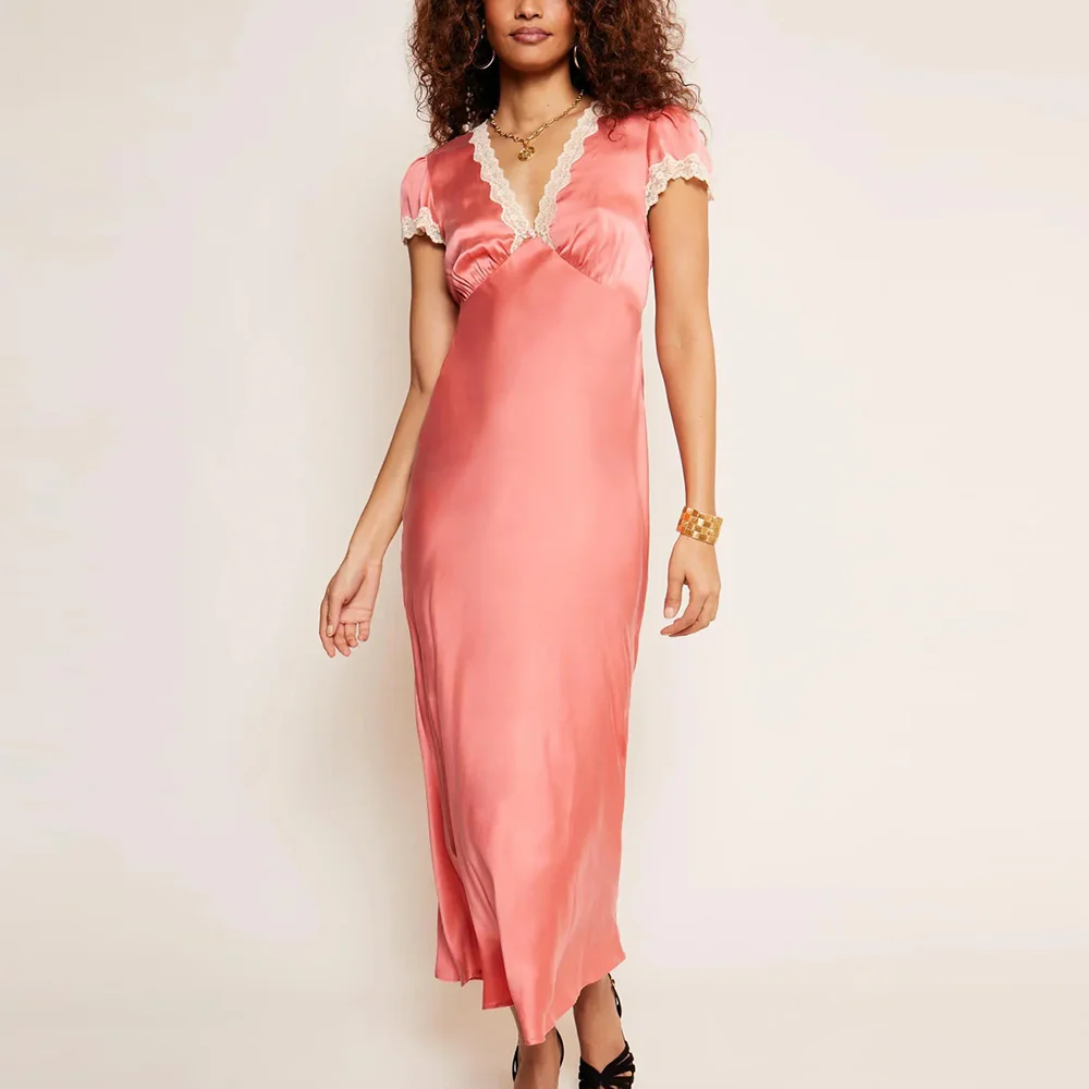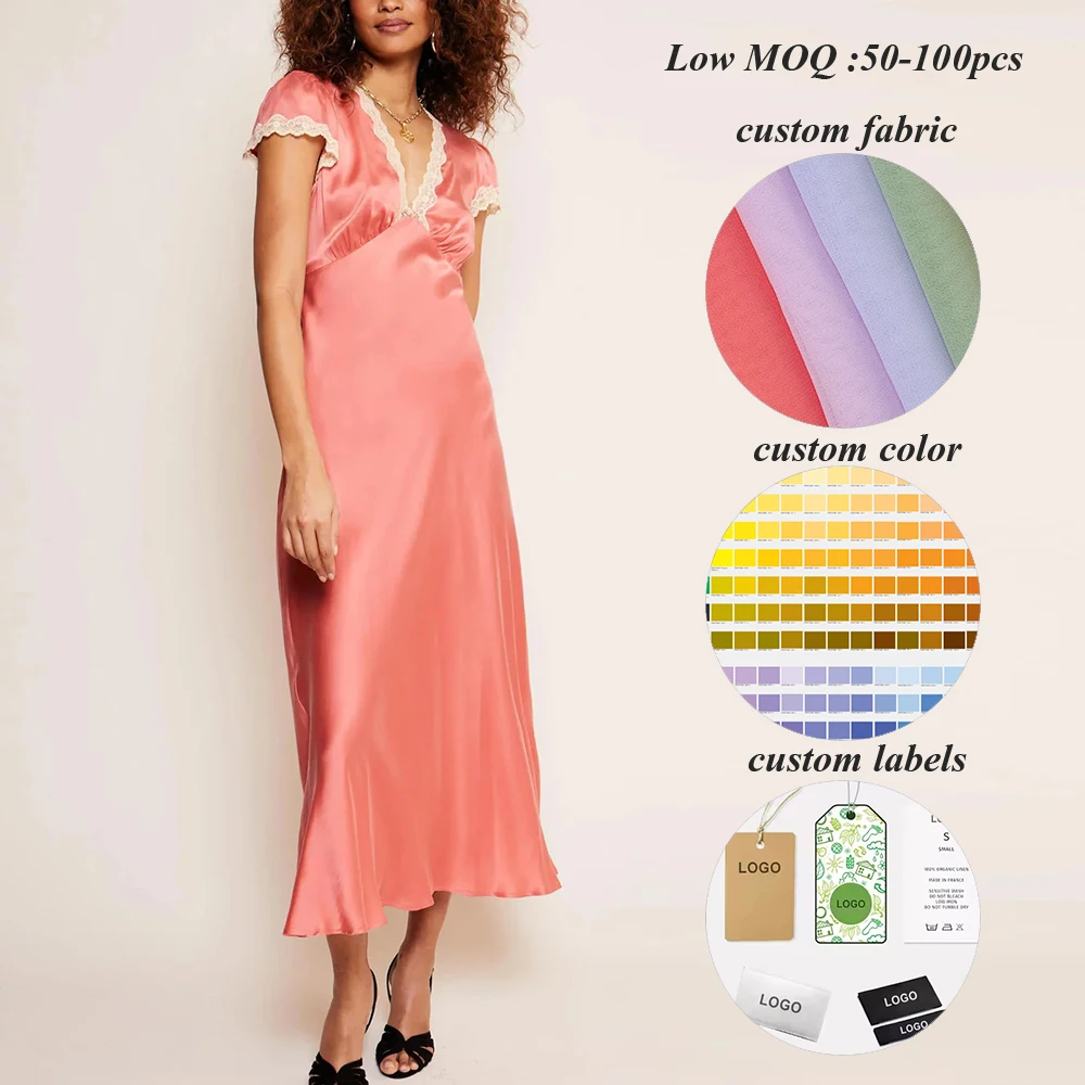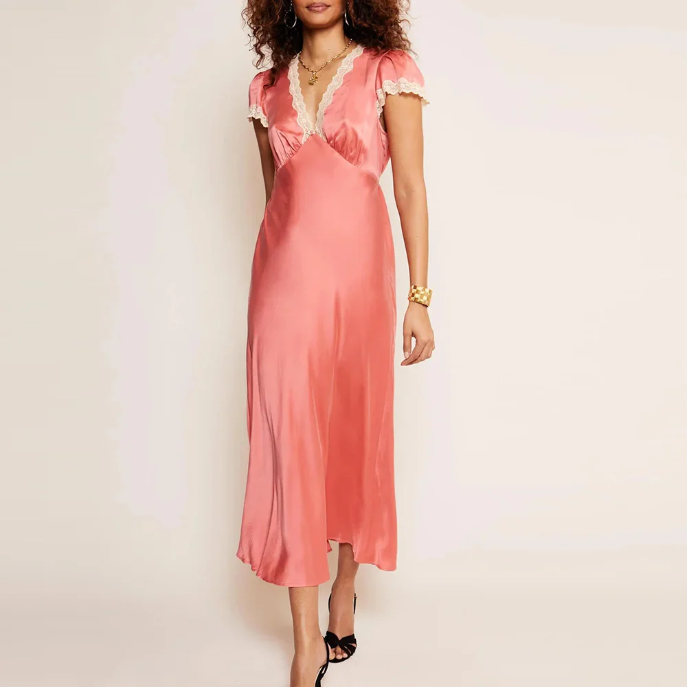 Manufacturer Wholesale 2026 New Style Solid Color Satin Dresses Custom Lace v Neck Women Short Sleeve Elegant Satin Midi Dress