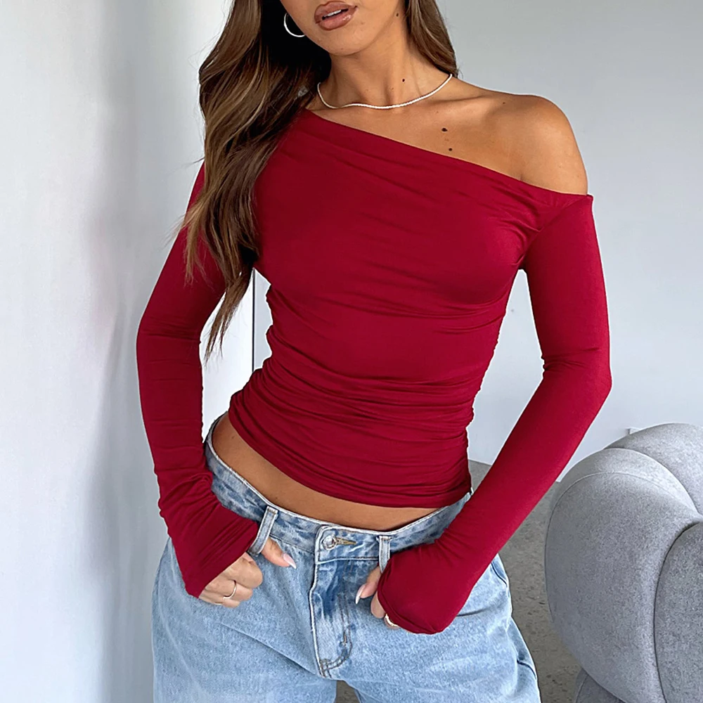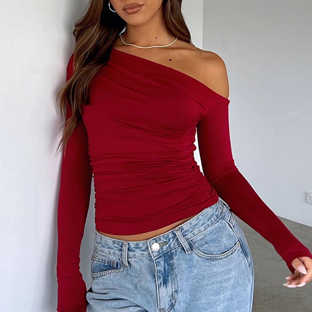 2026 Hot Selling Ruched Slim Fit Crop Top Tshirts Custom Solid Color Women Sexy One Shoulder Long Sleeve Blank Fitness t Shirt