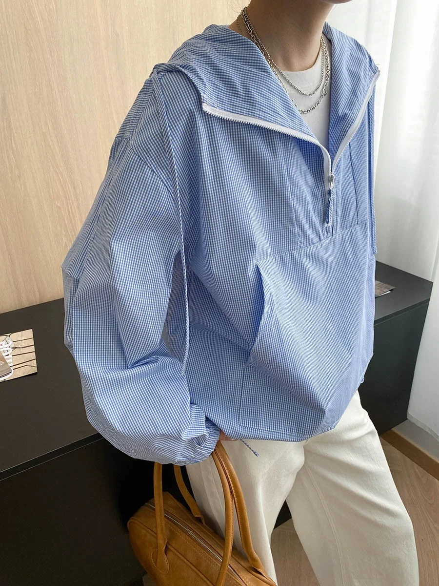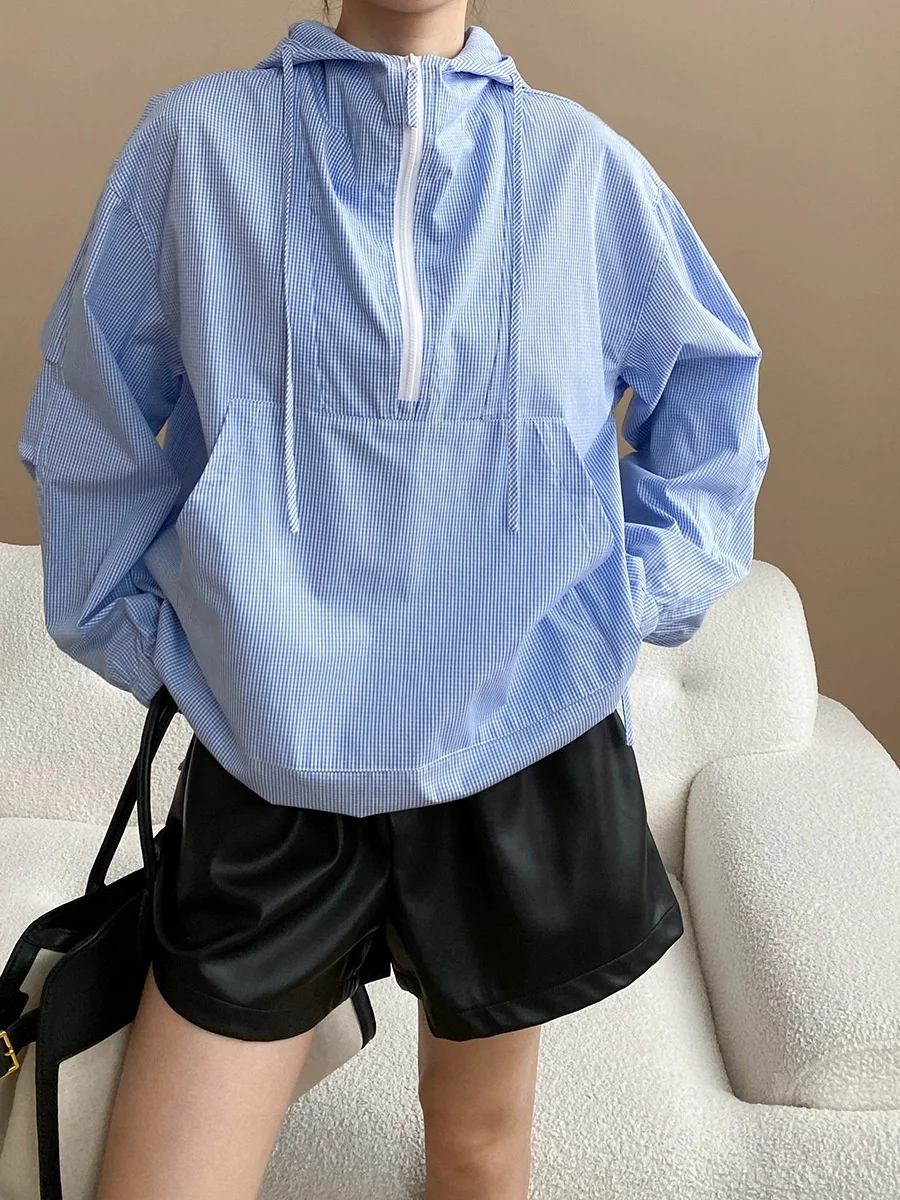 Women's Blue Hooded Half-Zip Shirt Casual -Fit Top