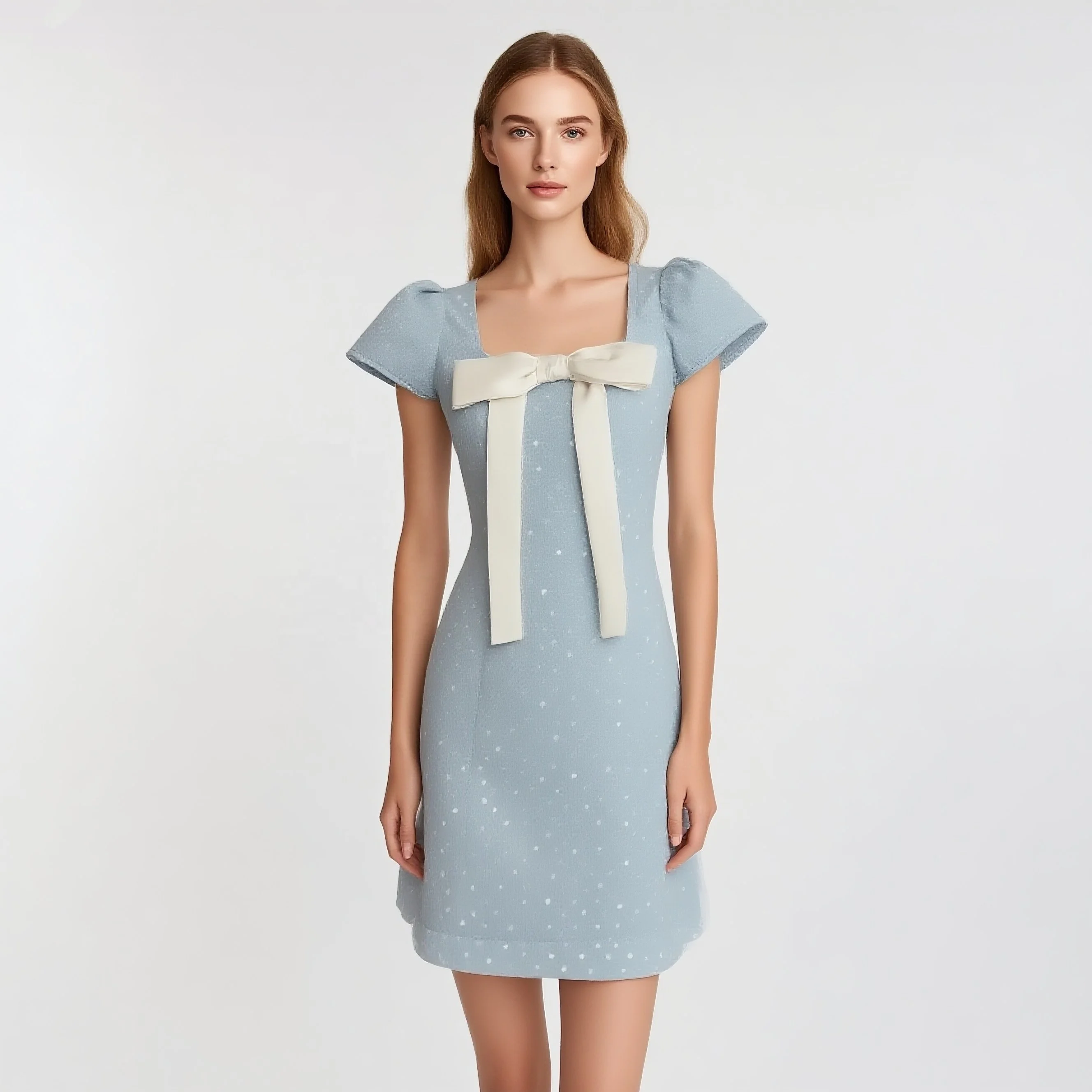 Custom Women's Polka Dot Mini Dress with Puff Sleeve and Large Bow Decoration
