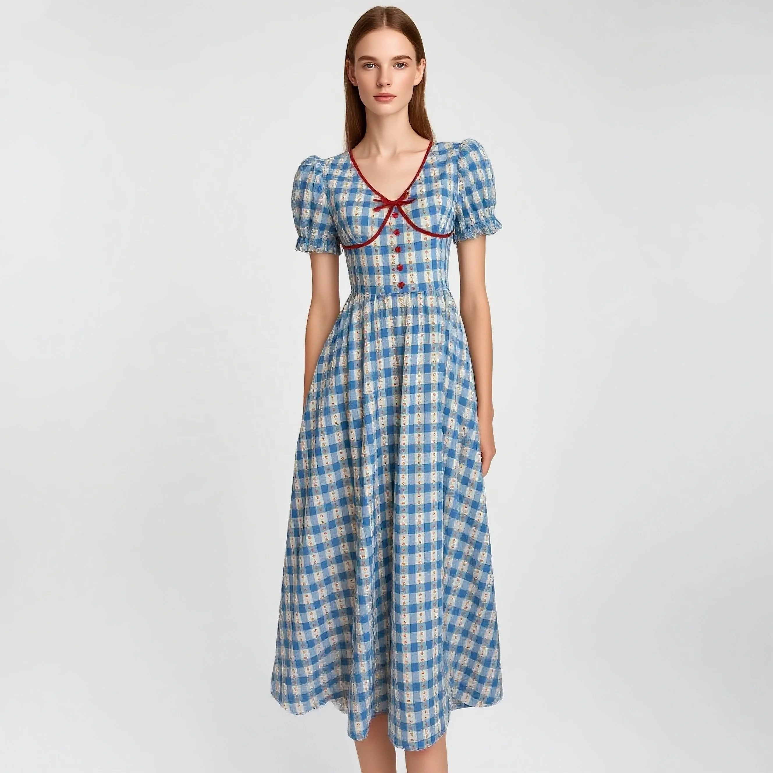 Custom Women's Blue Gingham Cotton Midi Dress with Puff Sleeve and Bow Decoration