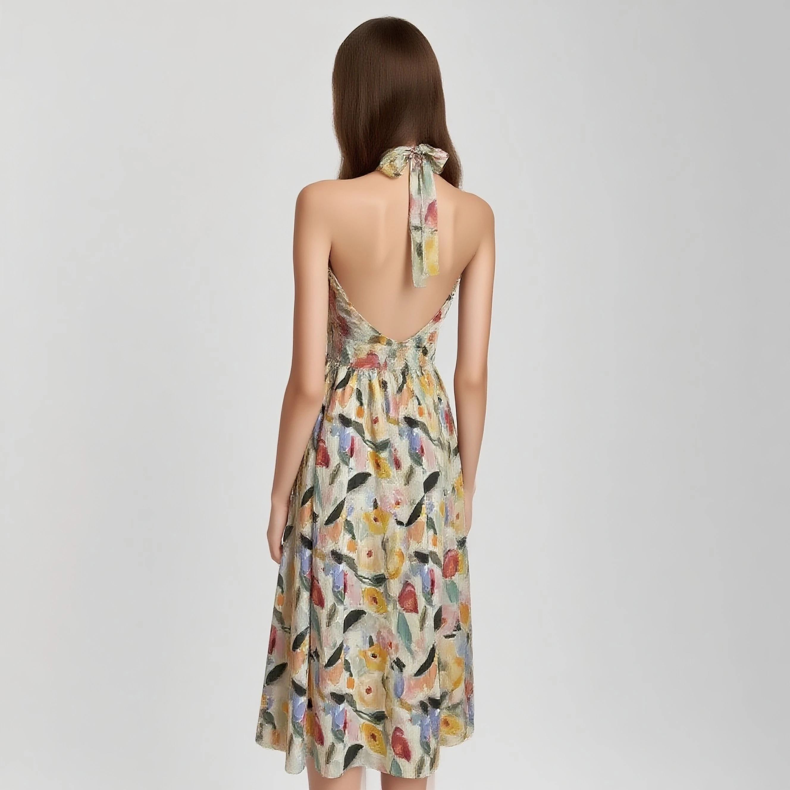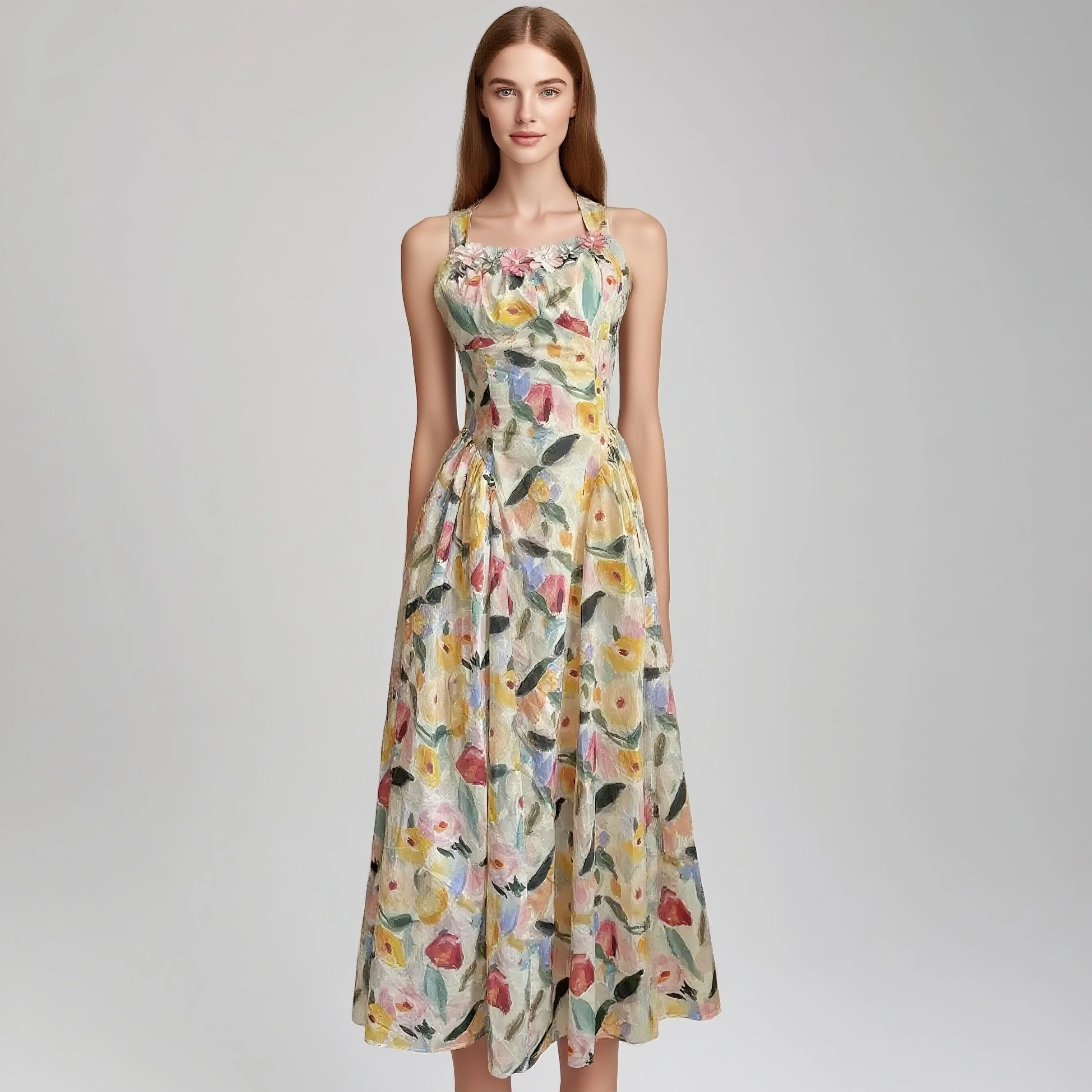 Custom High Quality Women's Halter Floral Linen and Cotton Midi Dress