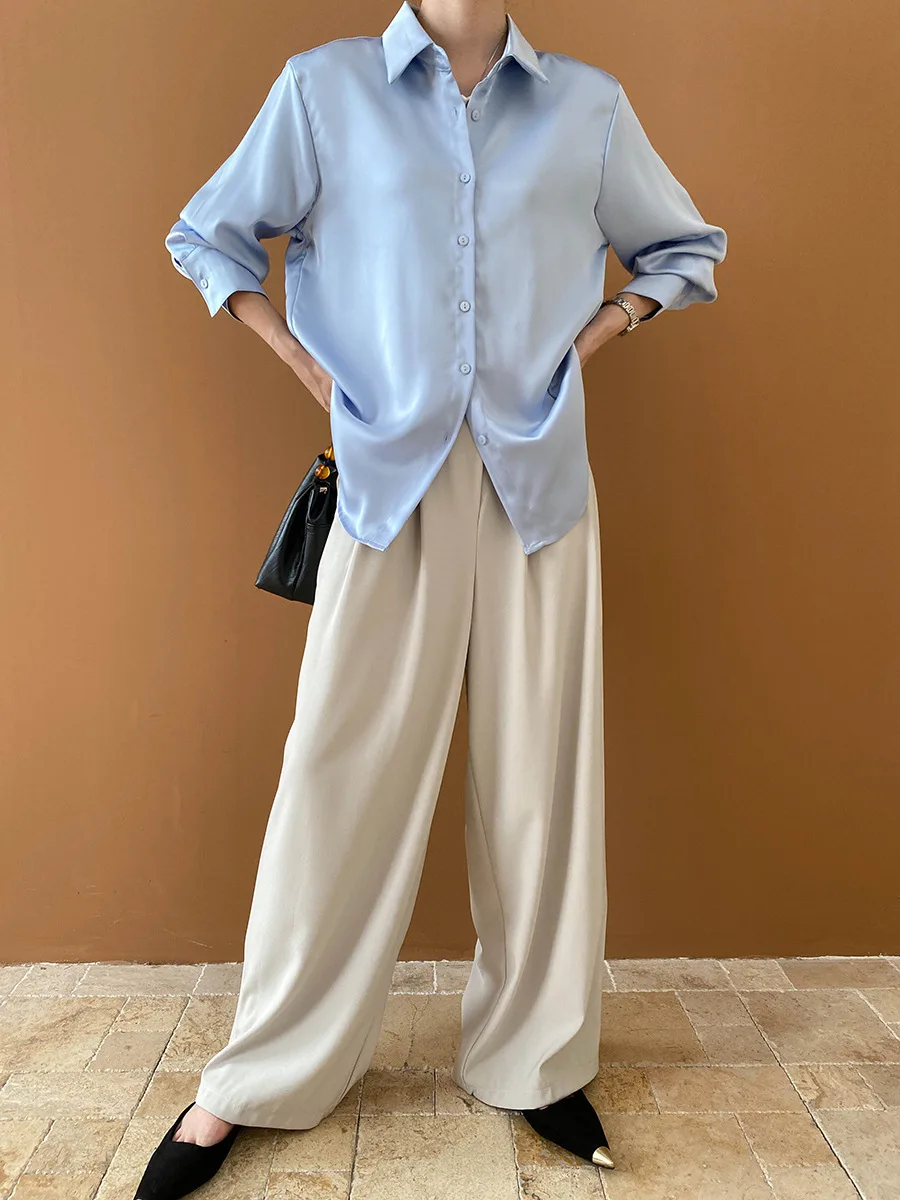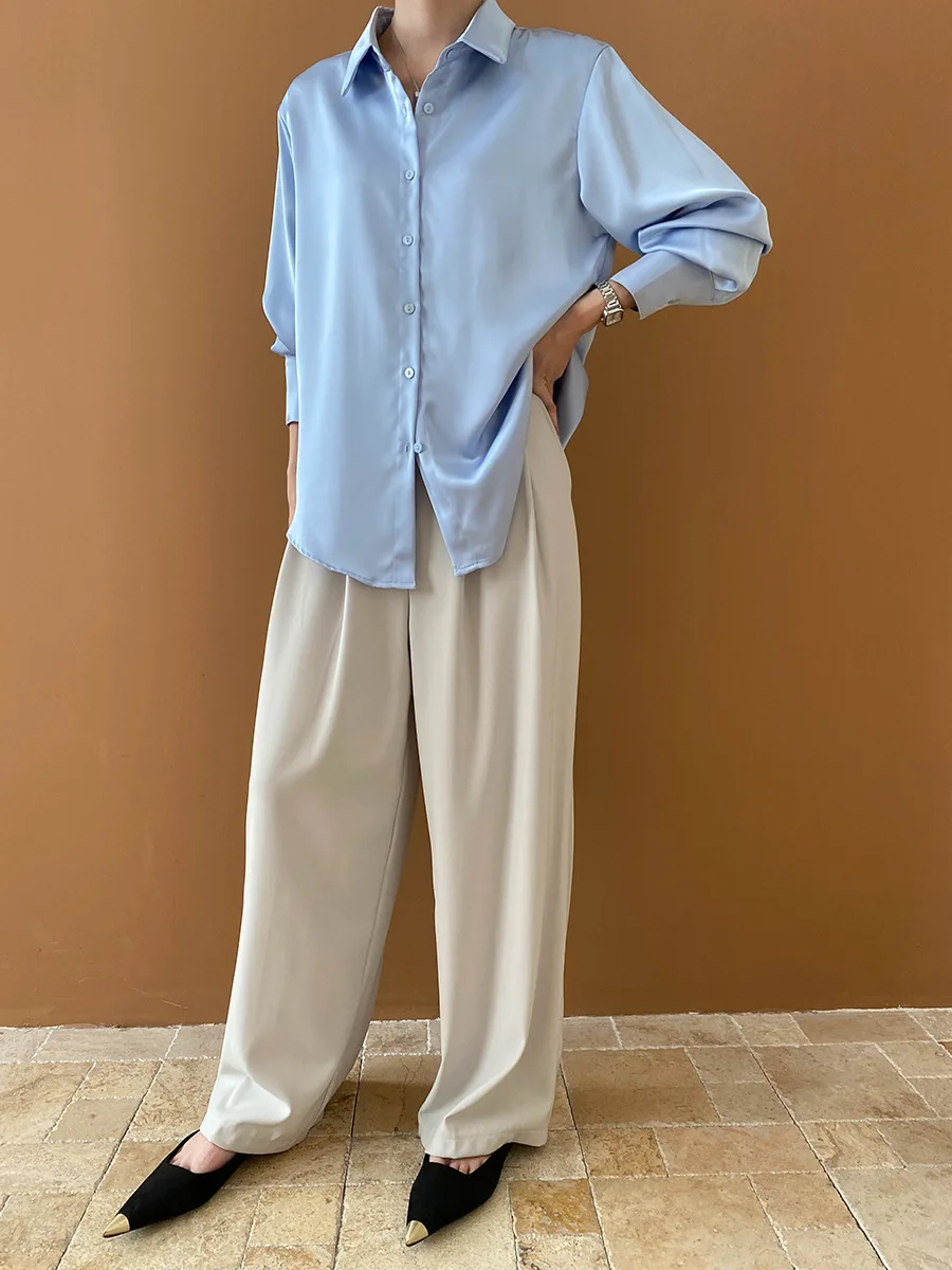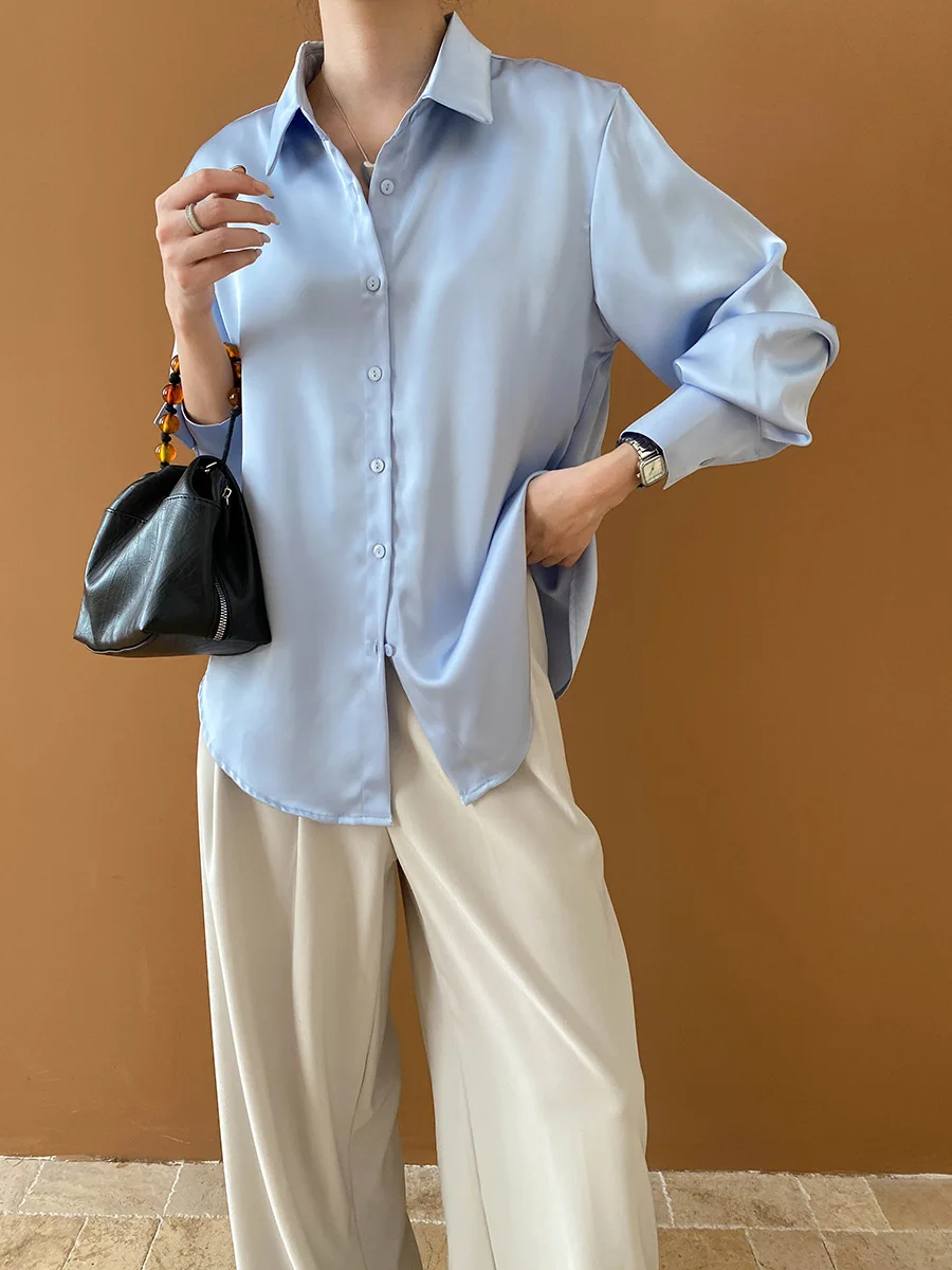 Custom Women's Elegant Satin Button-Down Shirt, Loose Fit for Office and Casual Wear