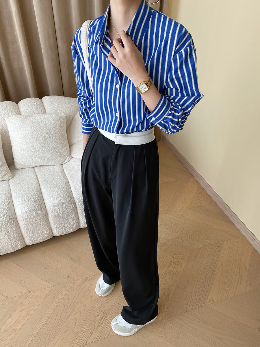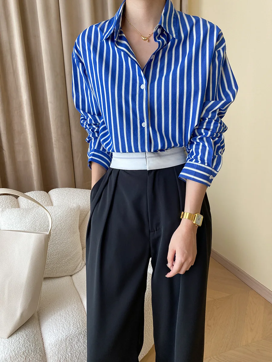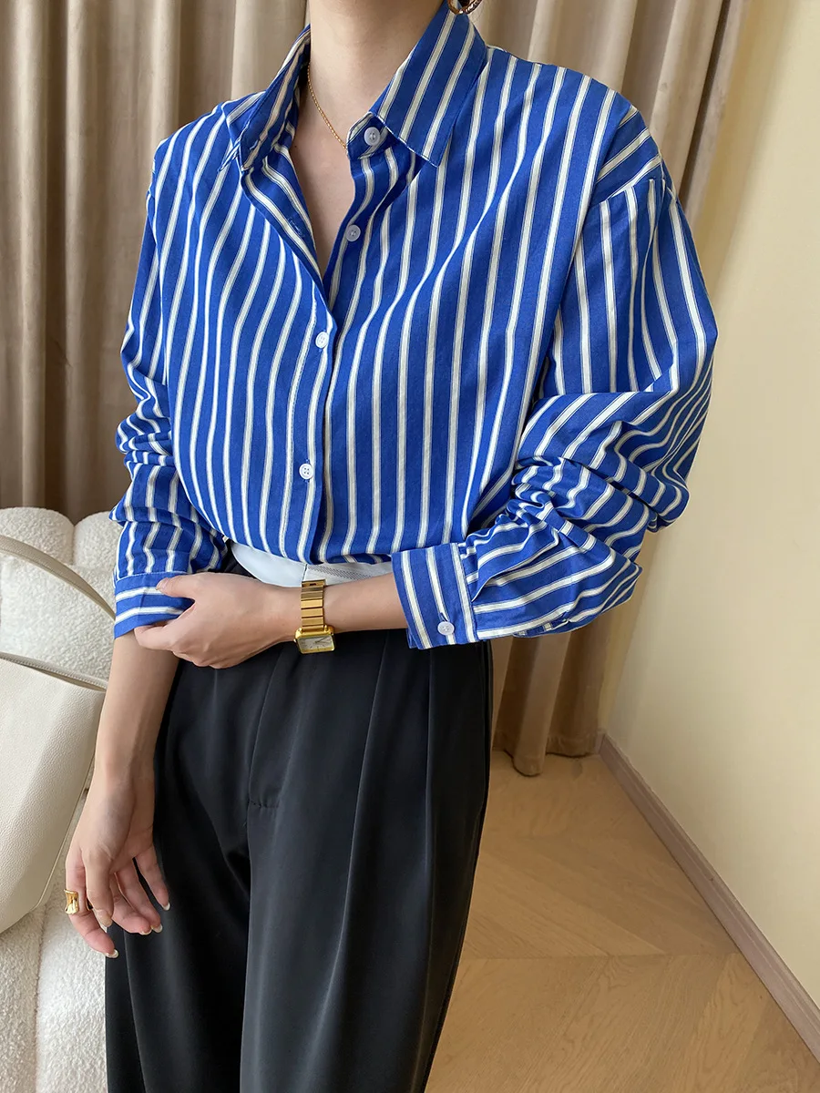 Custom Women's 100% Cotton Blue and White Striped Button-Down Shirt with Long Sleeve
