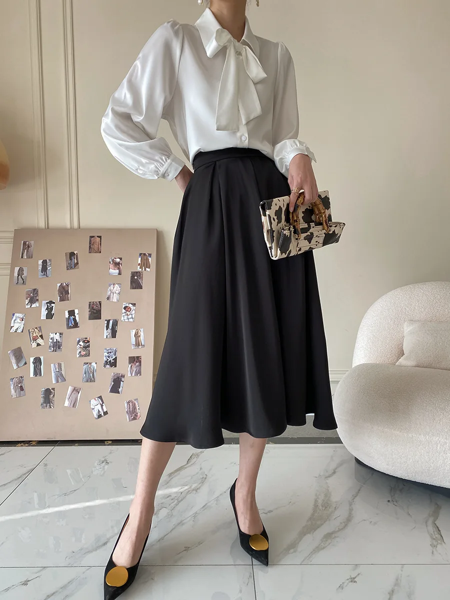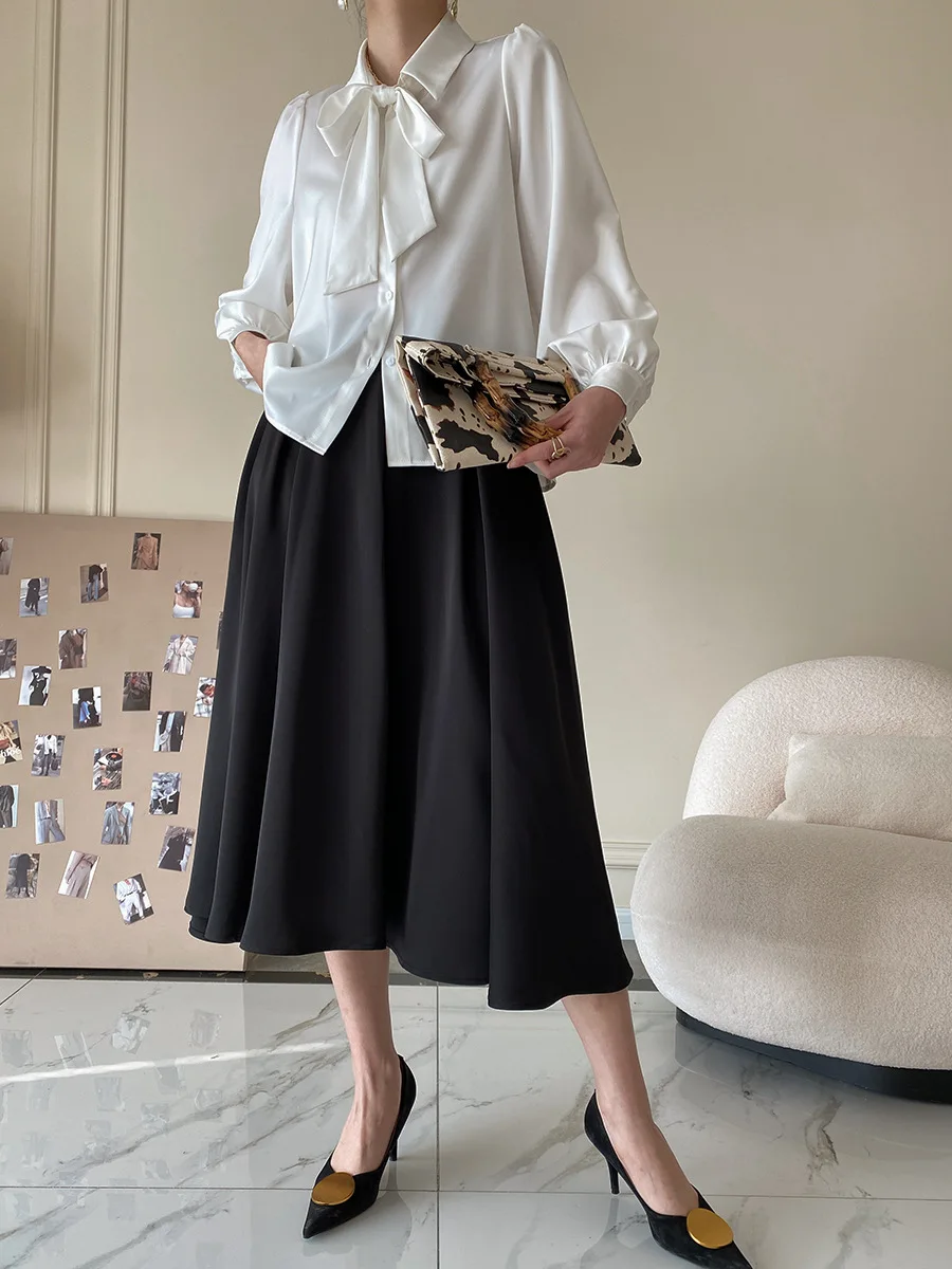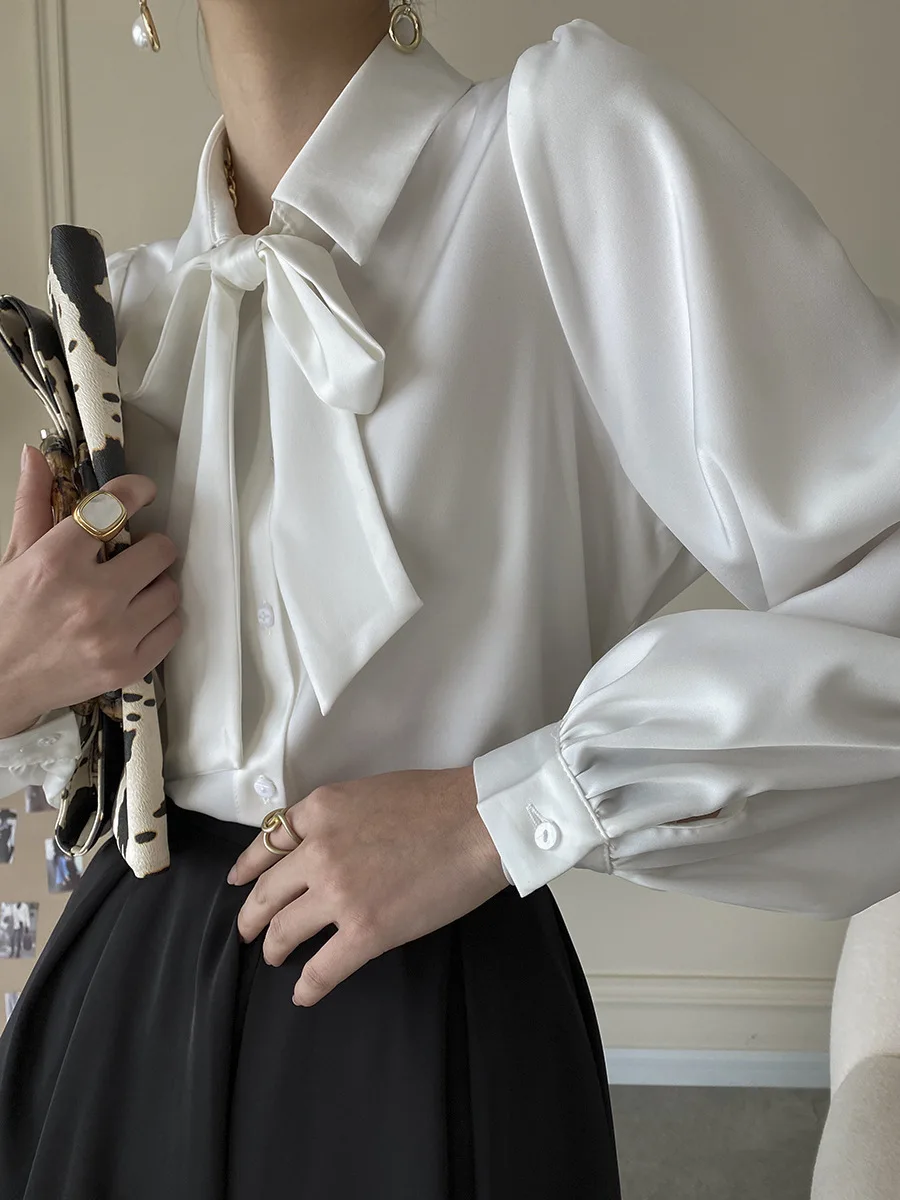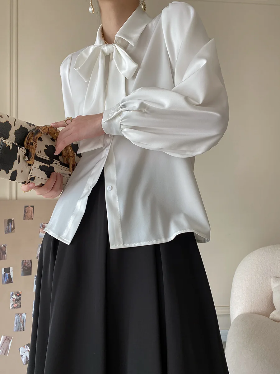 Custom Women's White Satin Blouse with Large Bow-Tie Collar and Puff Sleeves