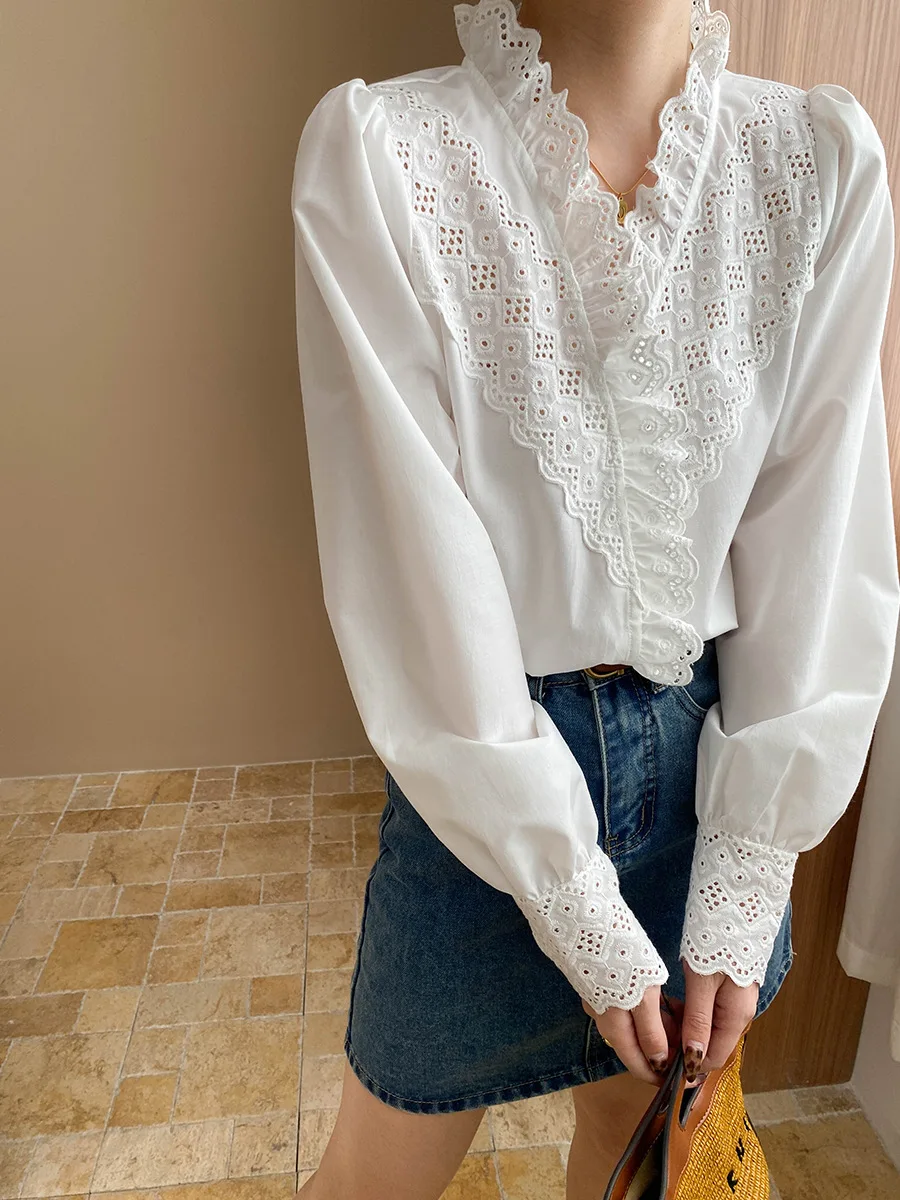 Custom Women's White Cotton Shirt with Lace Ruffle V-neck and Puff Sleeve