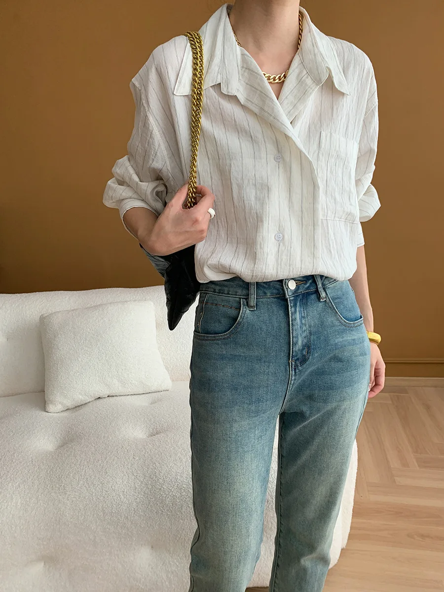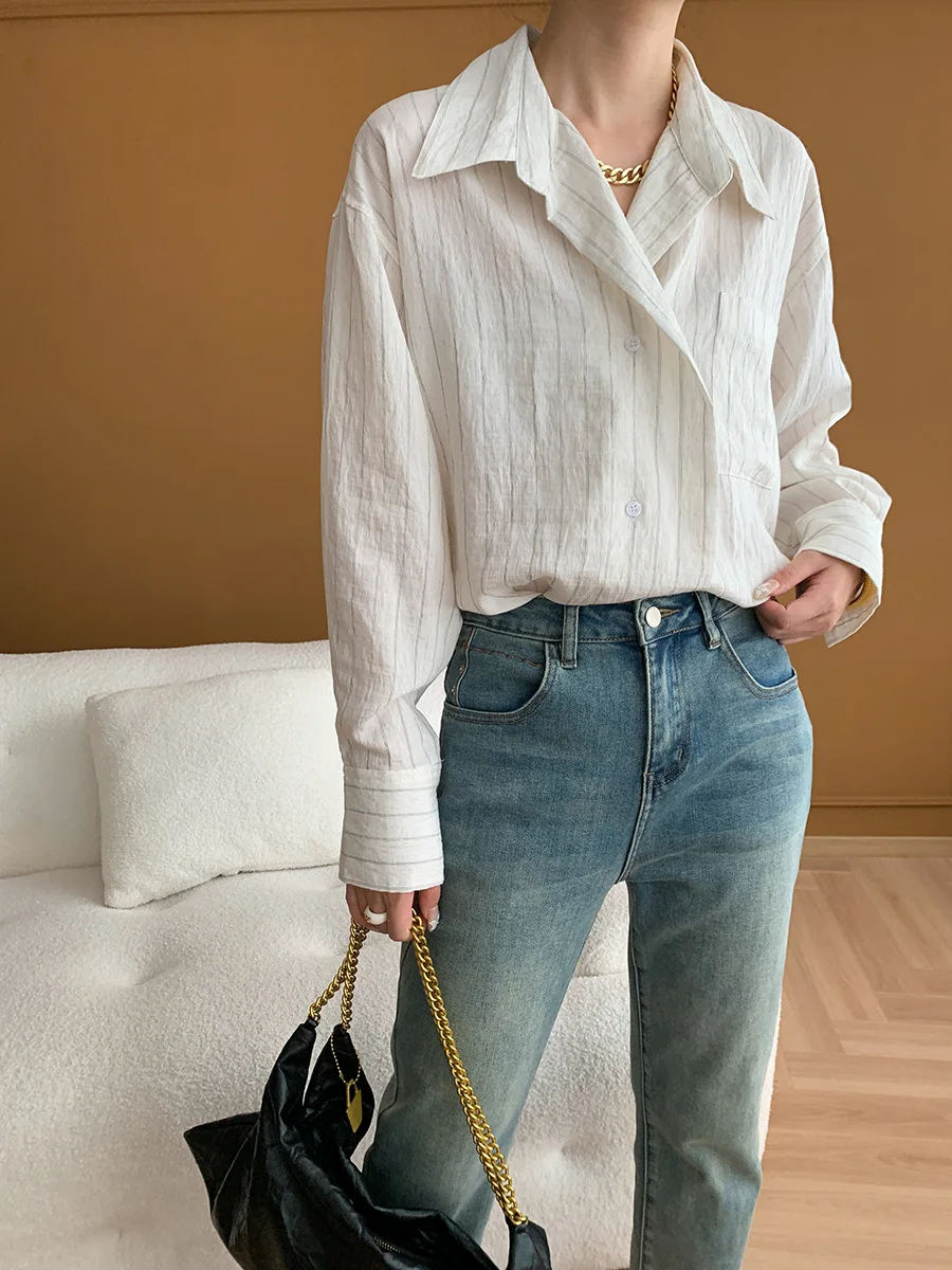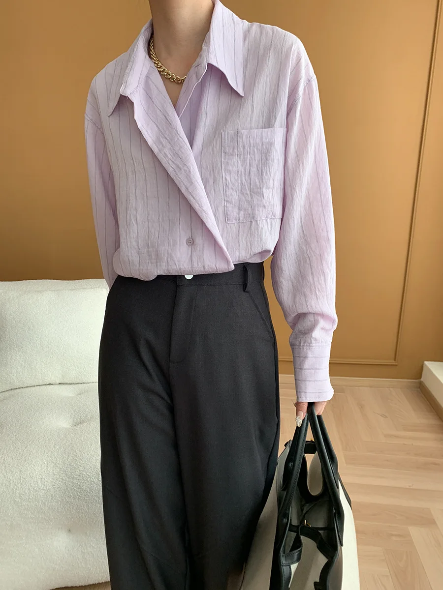 Custom Women's Light Purple Striped Long Sleeve Button-down Shirt with Chest Pocket