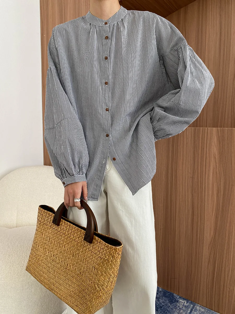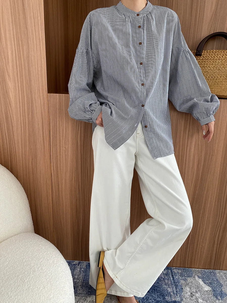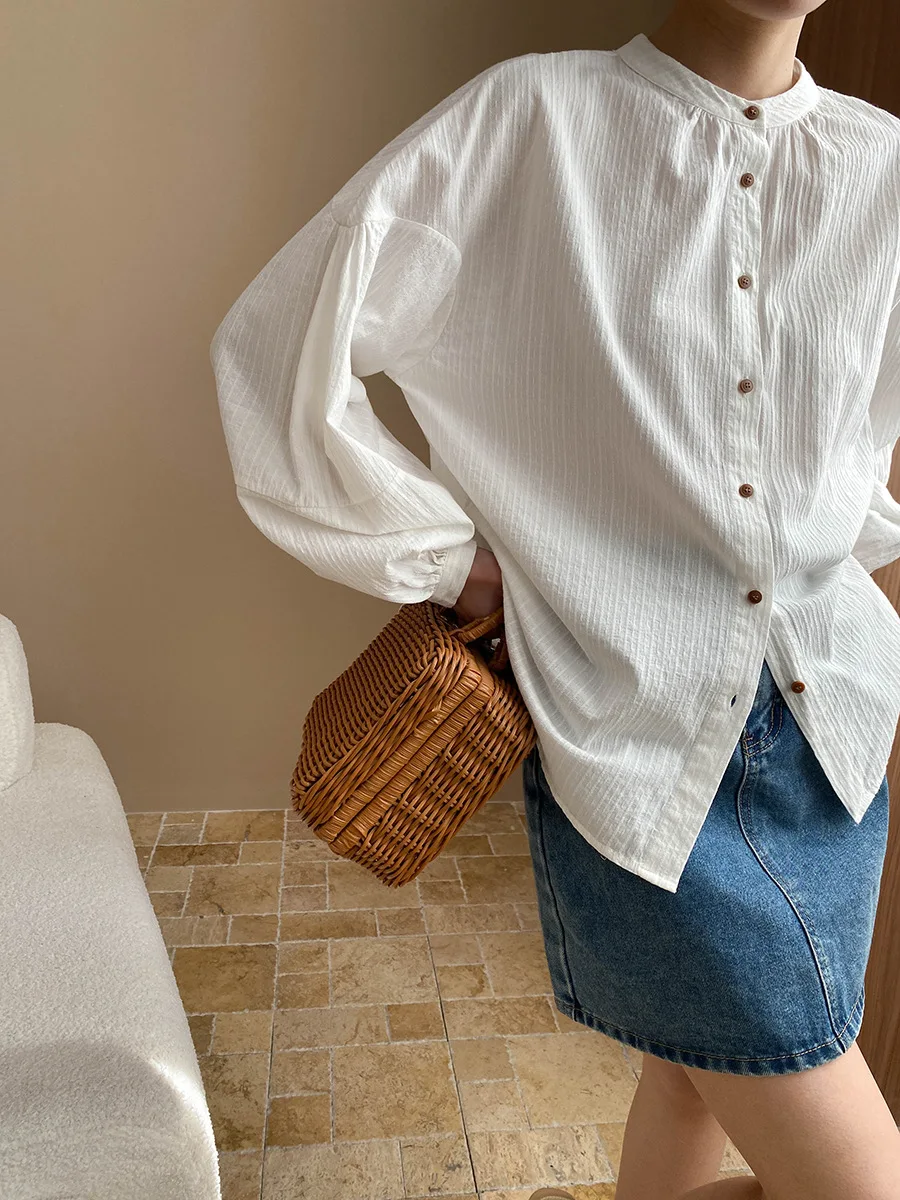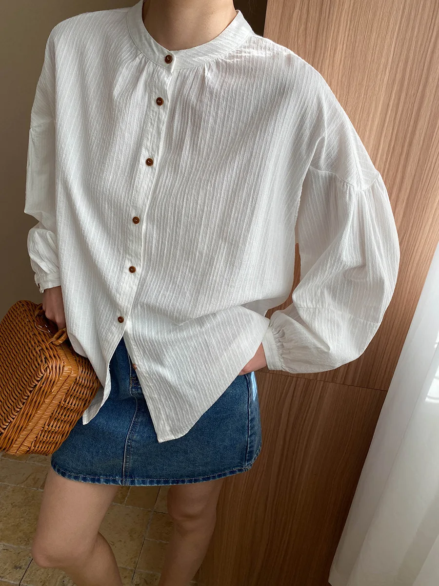 Custom Women's 100% Cotton White Long Sleeve Blouse with Stand Collar and Button Detail