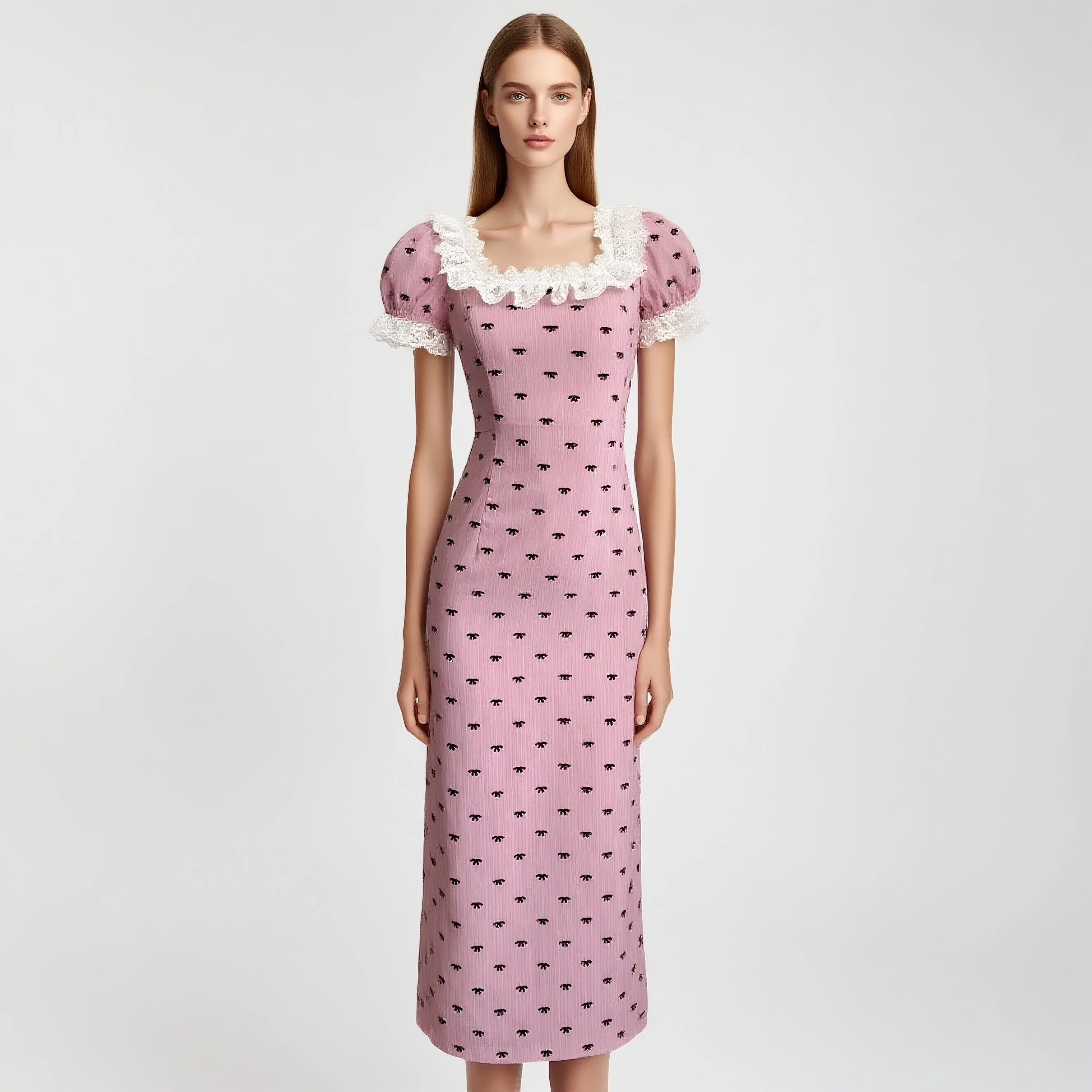 Custom Elegant Pink Midi Dress, Puff Sleeve Square Neck with White Lace Collar