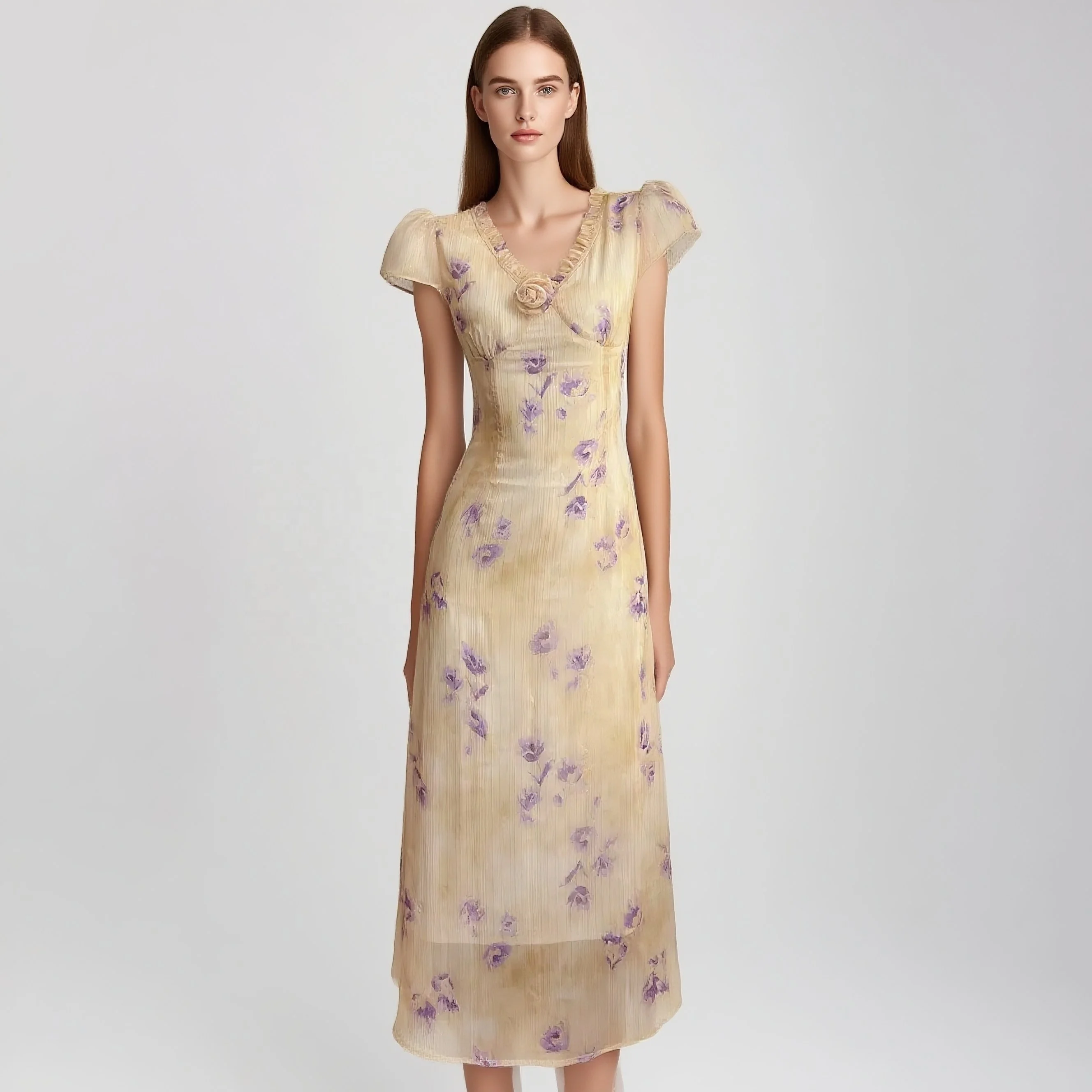 Custom Chiffon Floral Maxi Dress, V-Neck Puff Sleeve Ruffle Trim Party Dress
