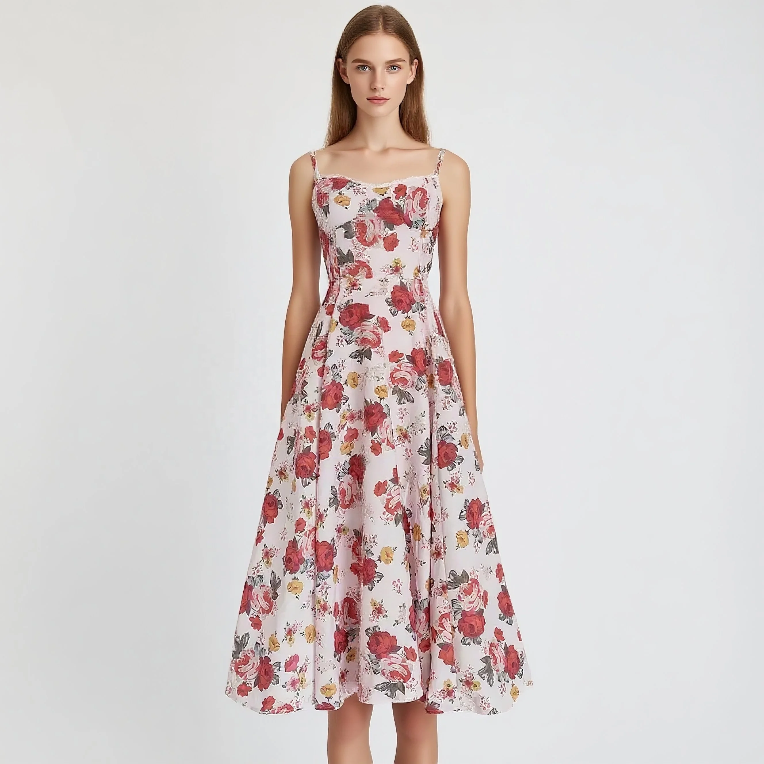 Pink Floral Print Spaghetti Strap Midi Dress, Elegant Summer Party Dress