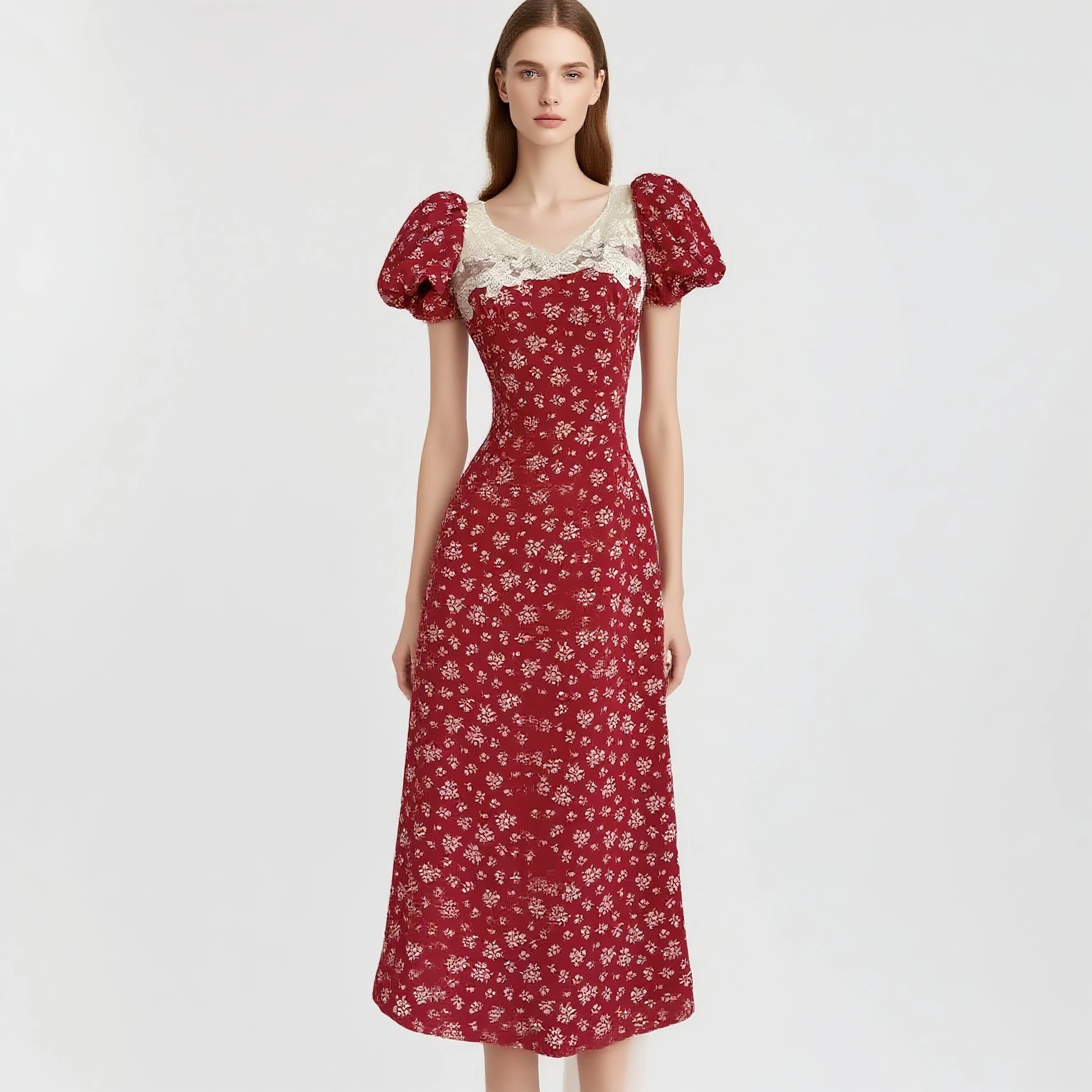 Custom Vintage Floral Red Dress with Lace Panel and Puff Sleeve Women's Elegant Midi Dress