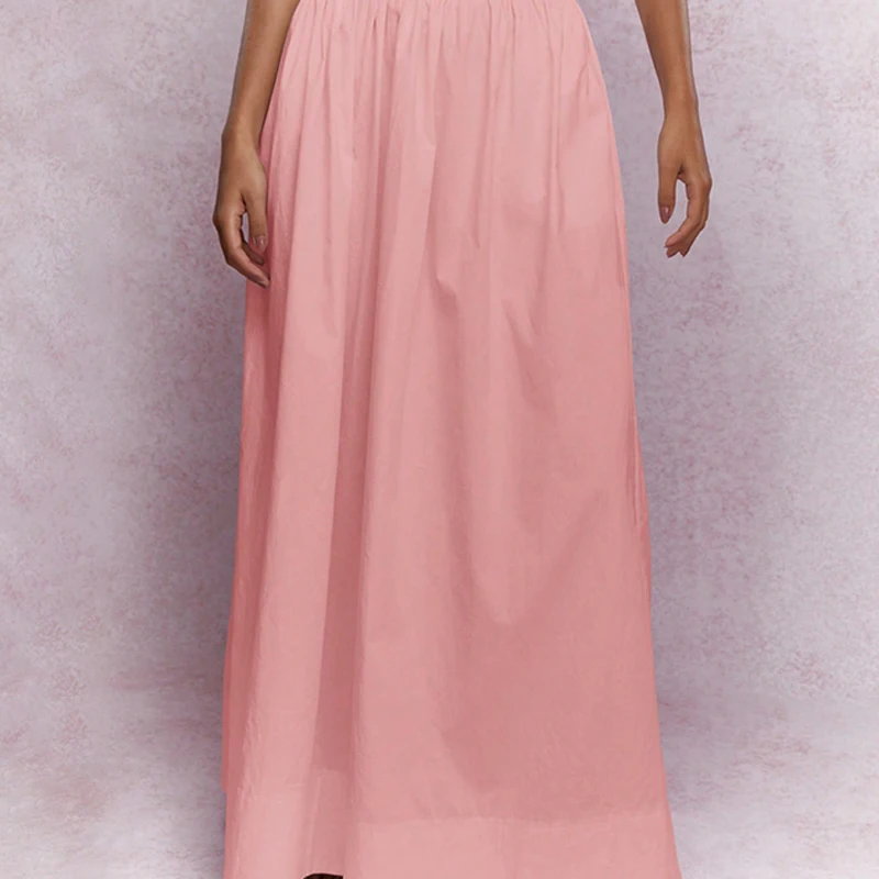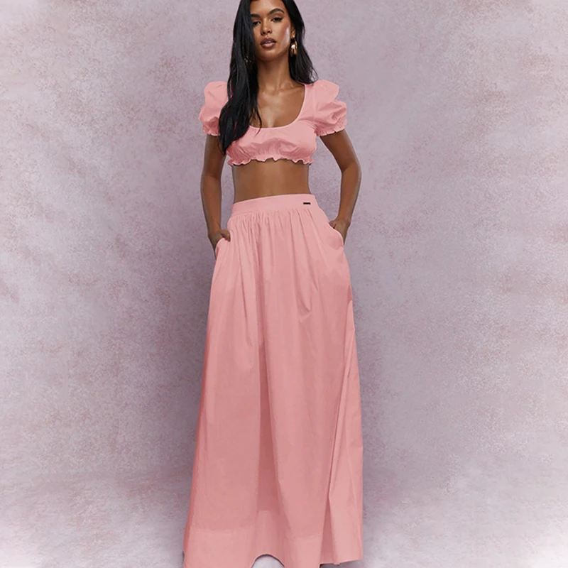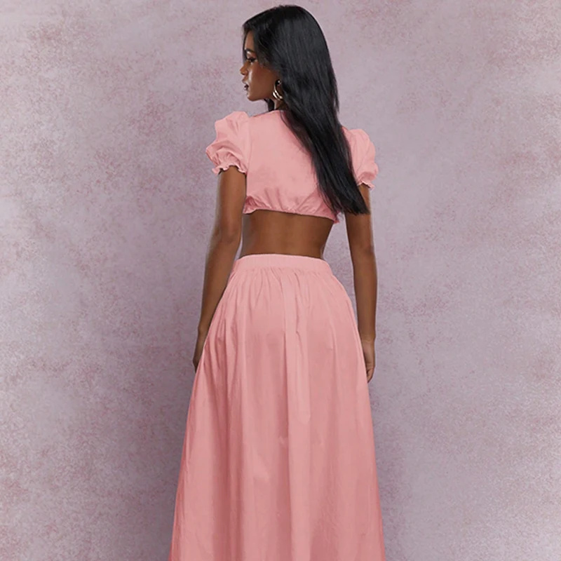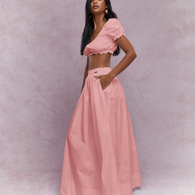 Elegant Women's Two-Piece Dress Set Crop Top with Short Sleeve Deep O Neckline Solid Pattern Maxi Dress for Casual Summer Style