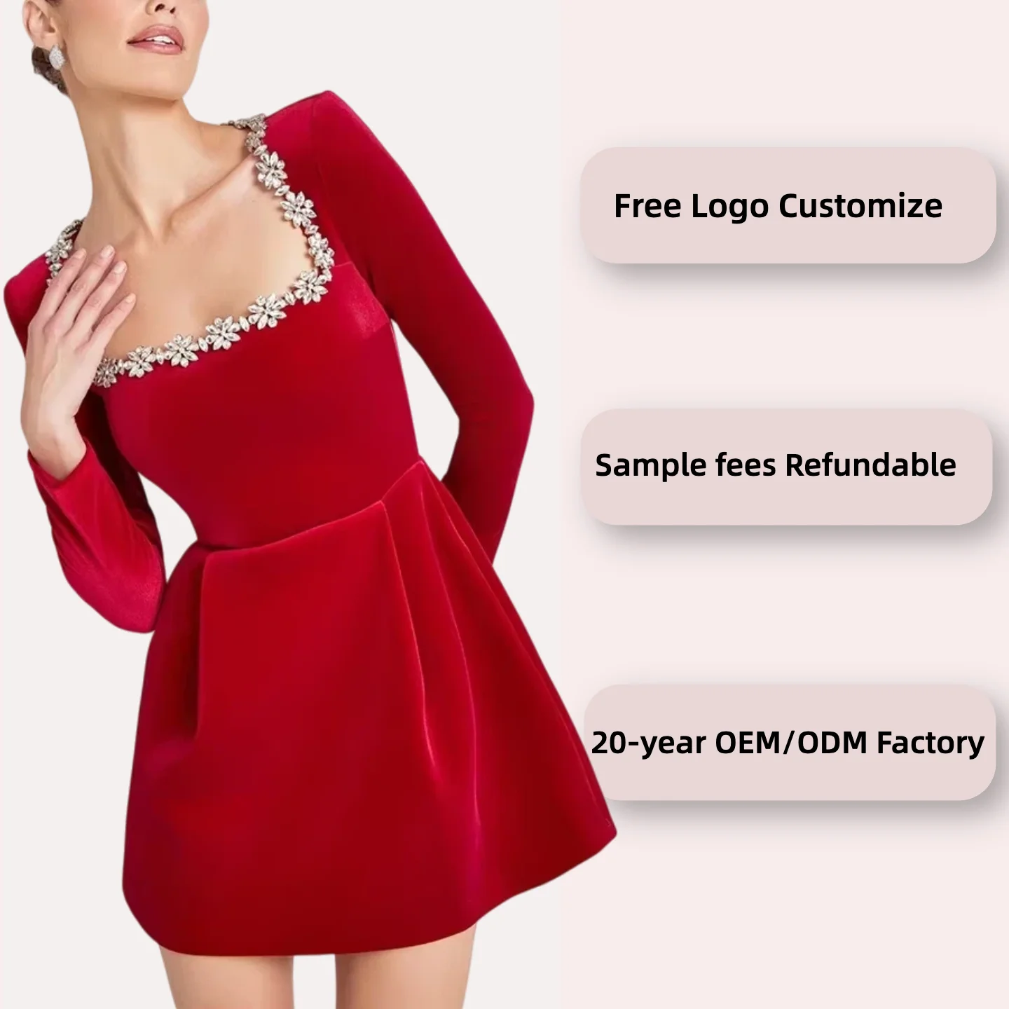 Wholesale Custom Logo Midi New Square Collar Diamond Floral Decoration Dress Classic A-Line Elastic Slim Elegant Women's Dresses