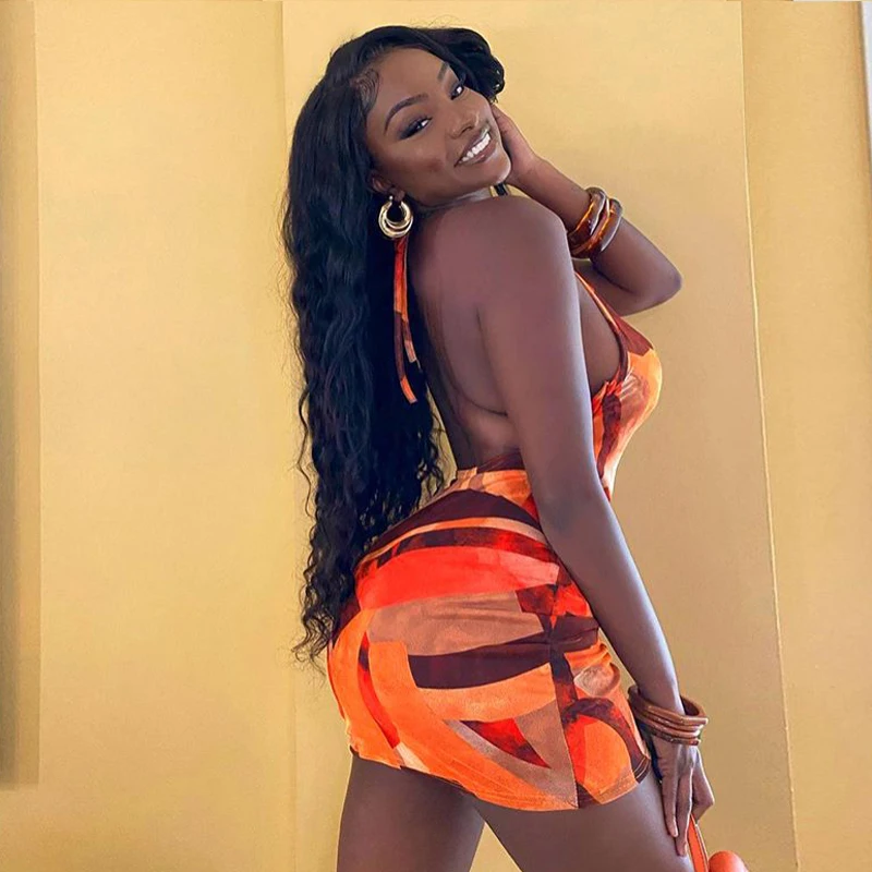 Women Casual Mini Dress Digital Printed Elastic Textile Spaghetti Strap Tie Back Detail Back Hollow Out for Summer Vacation