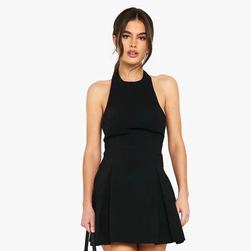 Women Casual Mini Dress Office Style Halter Design Round Neckline Back Hollow Out Detail for Elegant Summer Style