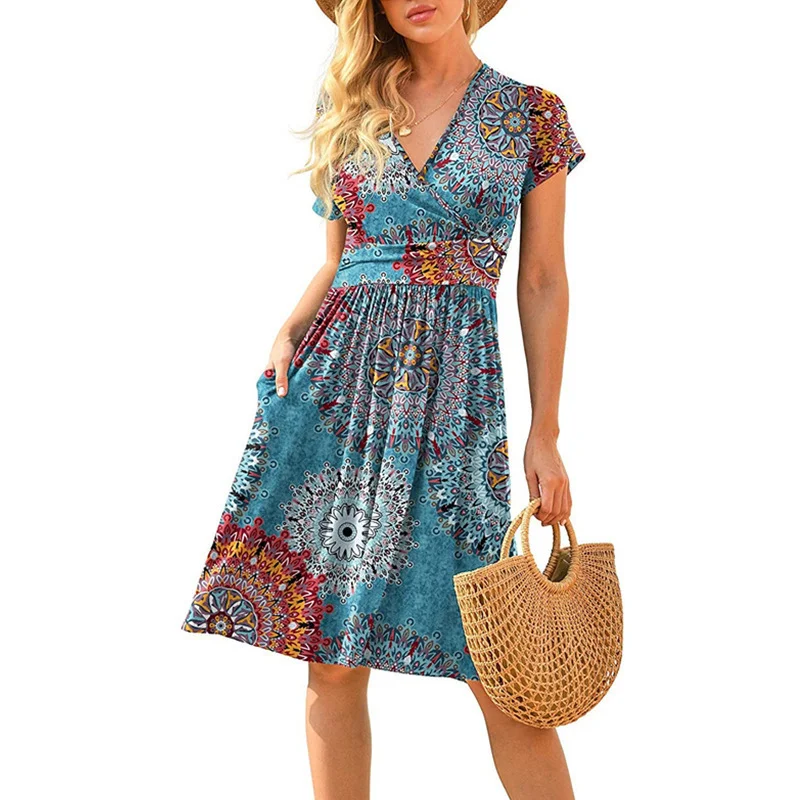 Wholesale 2026 New Women's Casual Summer Dress Knee-Length Neck Short Sleeve Floral Printing Natural Waistline Slim Fit Pocket