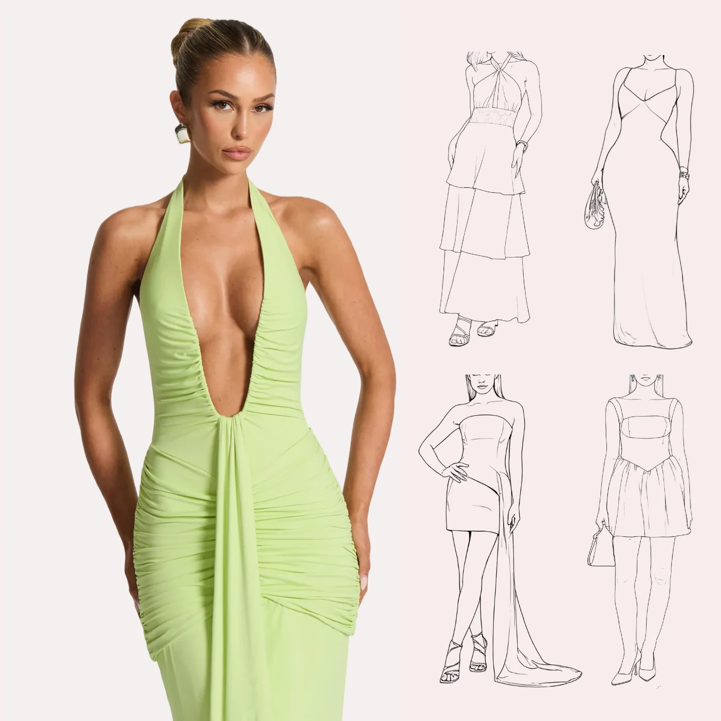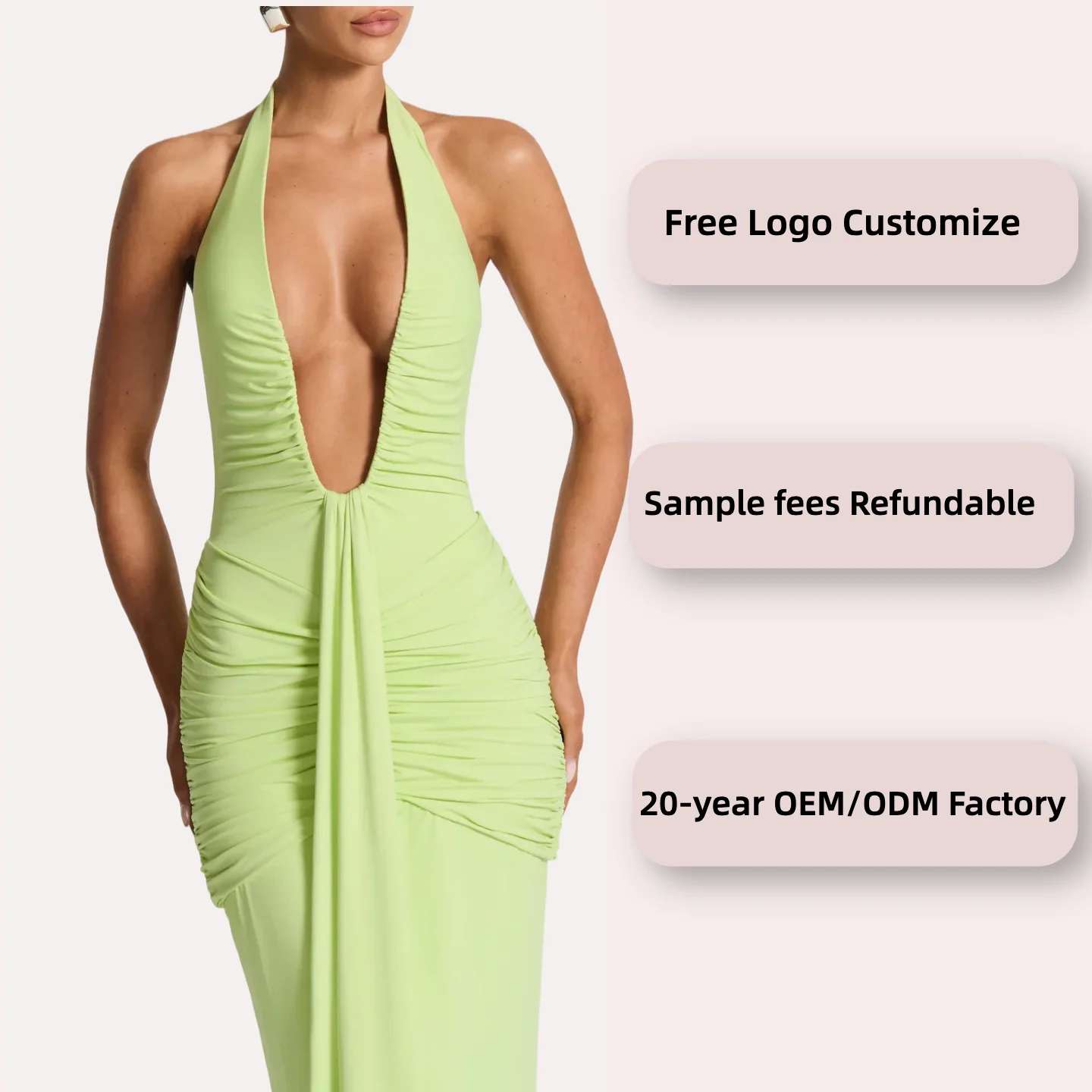 Summer Maxi Dress Halter Sleeveless Draped Club with Deep V Neck Backless Casual Ruched Sexy Solid Green Prom Evening Dress