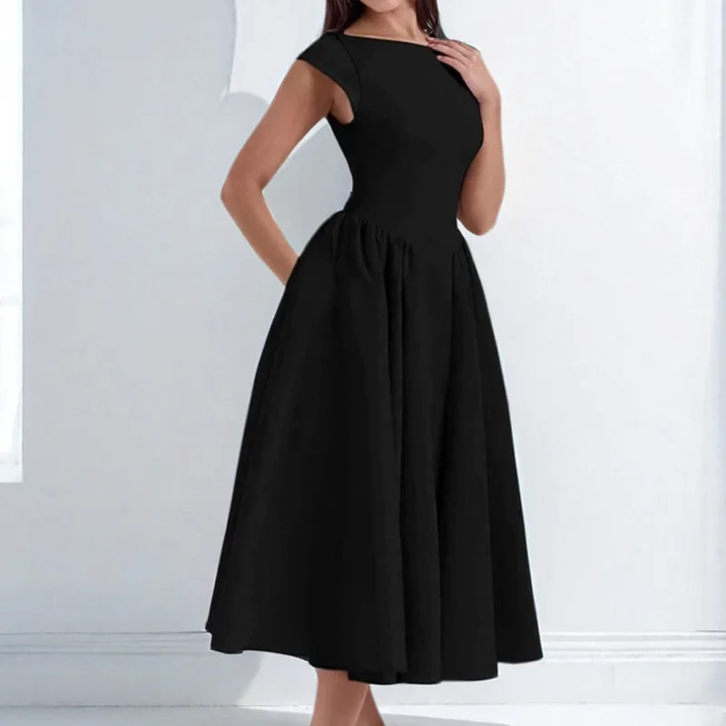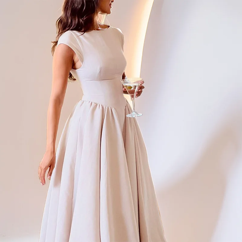 2026 Women Backless A-line Sexy Maxi Dress Gown Solid Hollow Out Sleeveless High Waist Club French Style Pleated Dress