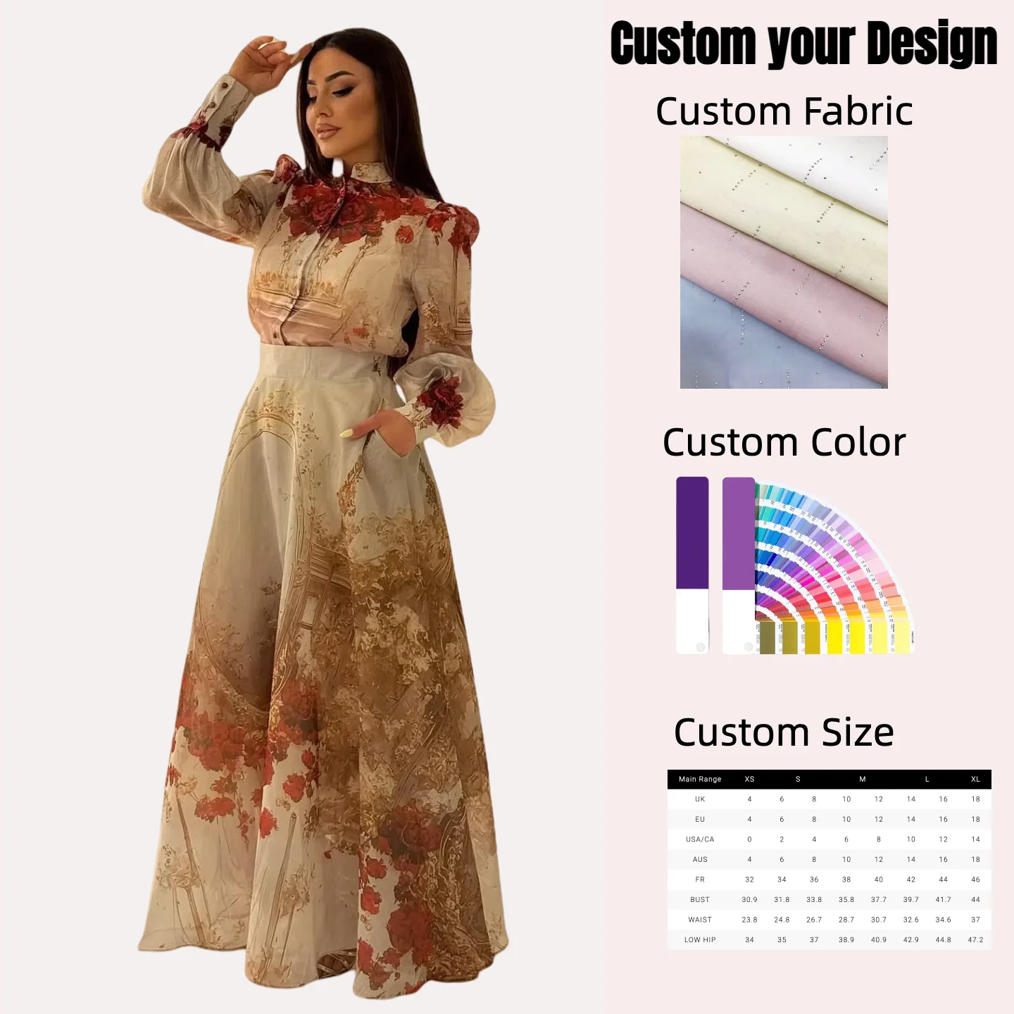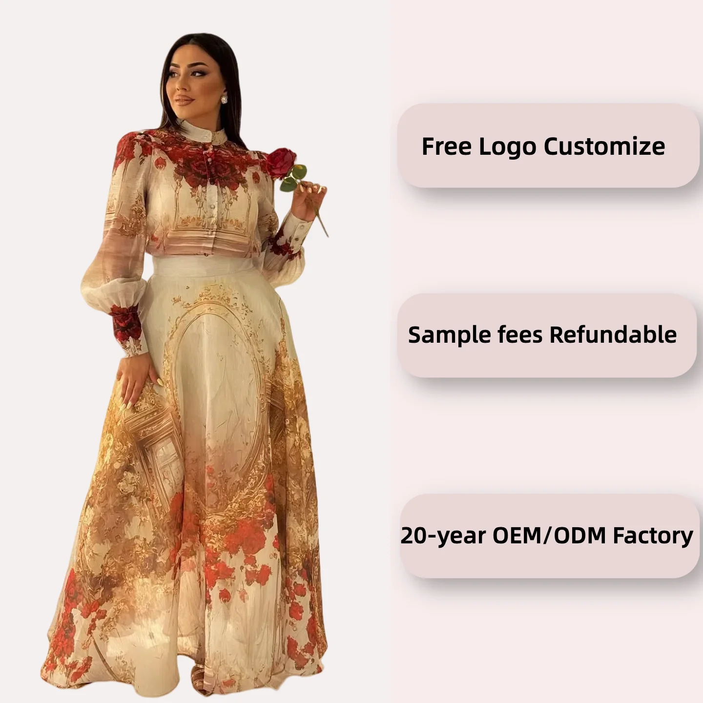 Custom Classical Women's Two-Piece Dress Floral Embroidered Blouse & Gold Pattern Party Dress Skirt Elegant Party Wear OEM
