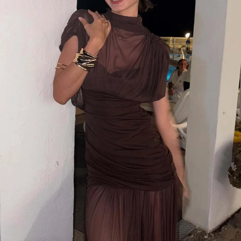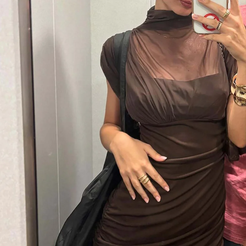 Elegant Winter 2026 0 Neck Ruched Mesh Draped Midi Dress for Evening Parties and Formal Events
