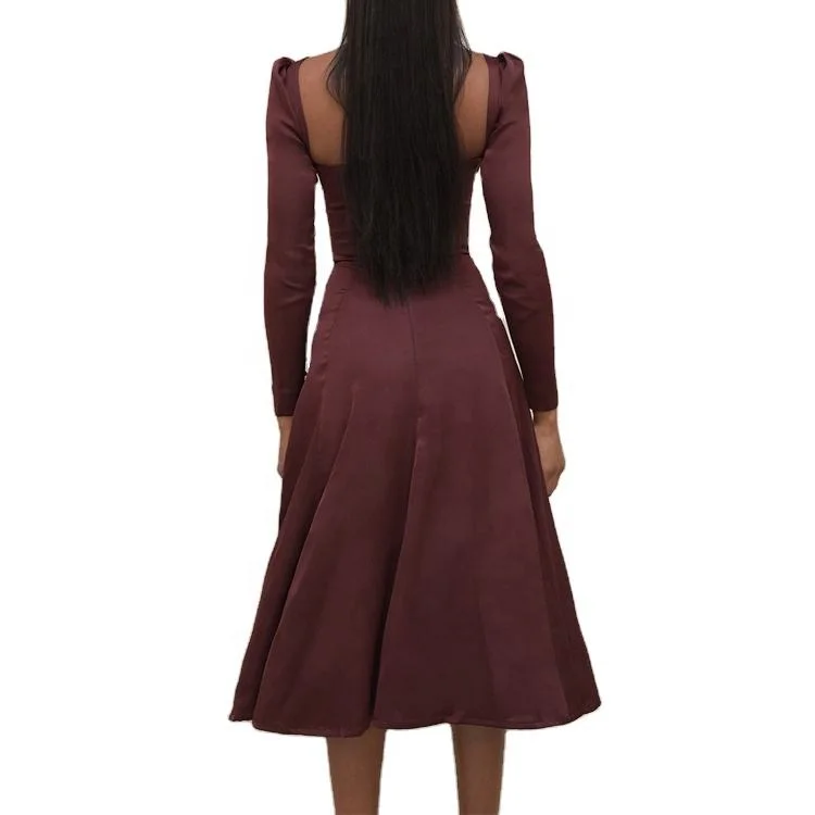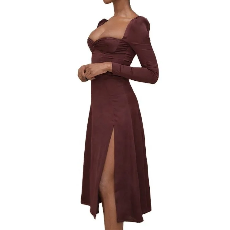 Elegant Women Long Sleeve Party Dress Long Sleeve Midi Velvet Dress Square Neck Autumn Midi Dress with High Split