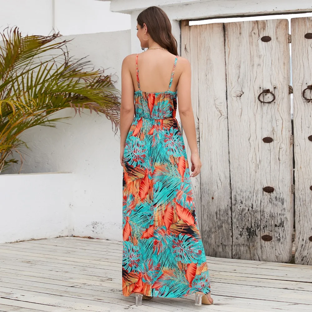 Wholesale Fashion Women's New Bohemian Print Dress Sexy V-neck Sleeveless Sling Long Sundress