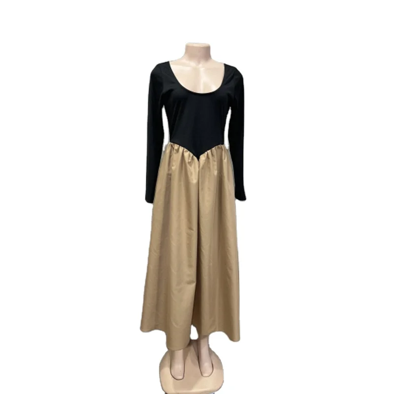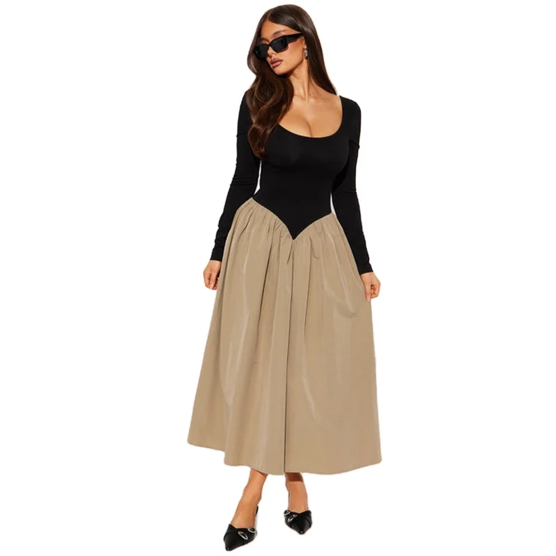 Women's Elegant Casual Dress Elastic Top Deep O Neck Long Sleeves Contrast Color Maxi Length Sweet Summer Outfit Back Zipper
