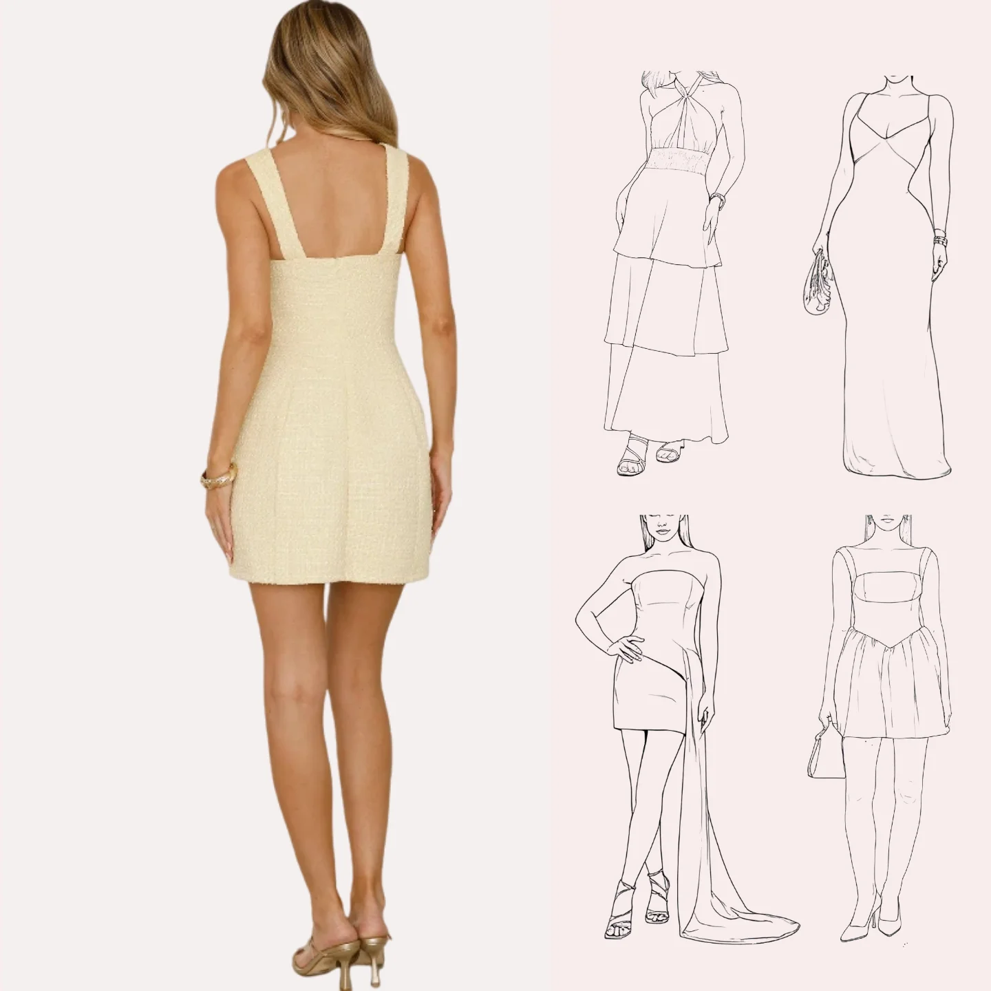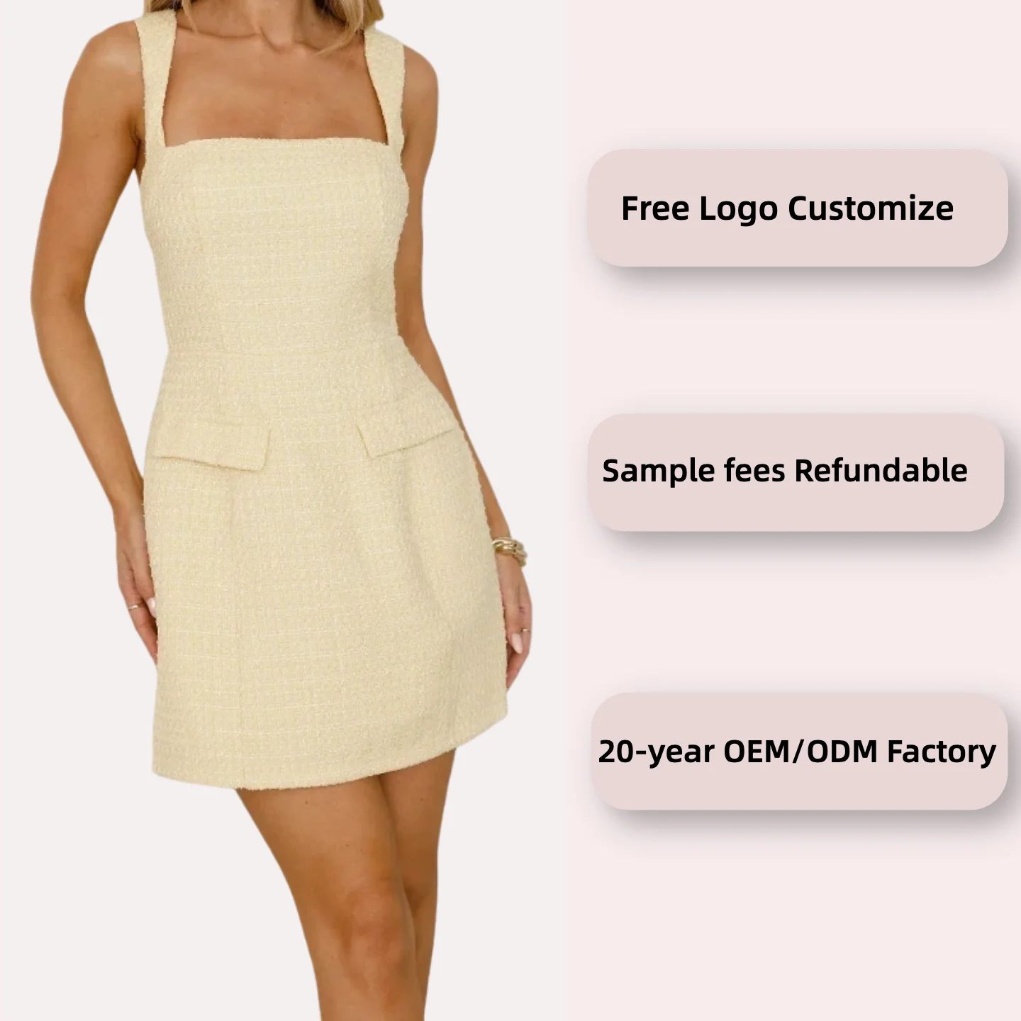 Women's Casual Summer Mini Dress with Square Neck Backless Halter Knee Length Solid Faux Pockets Tweed Woven Fabric Daily Wear
