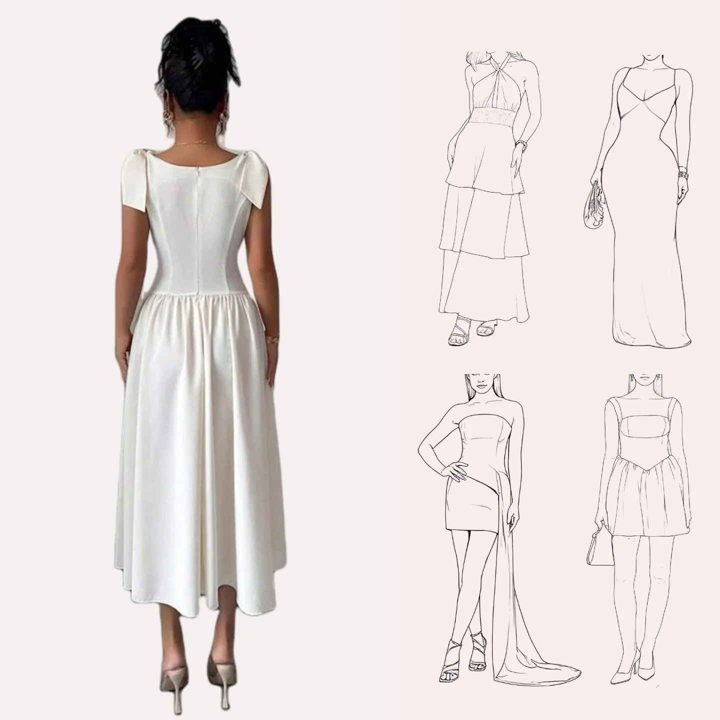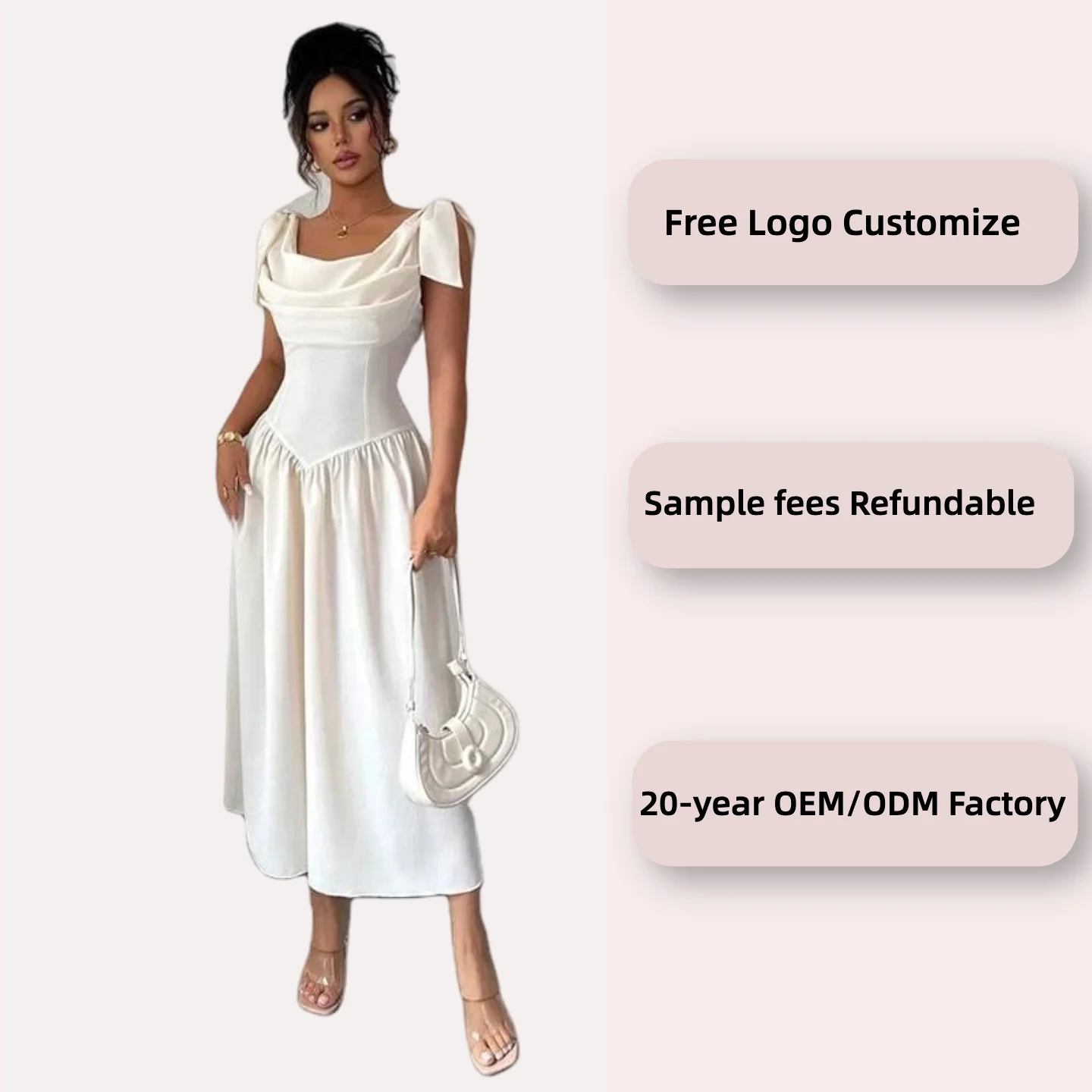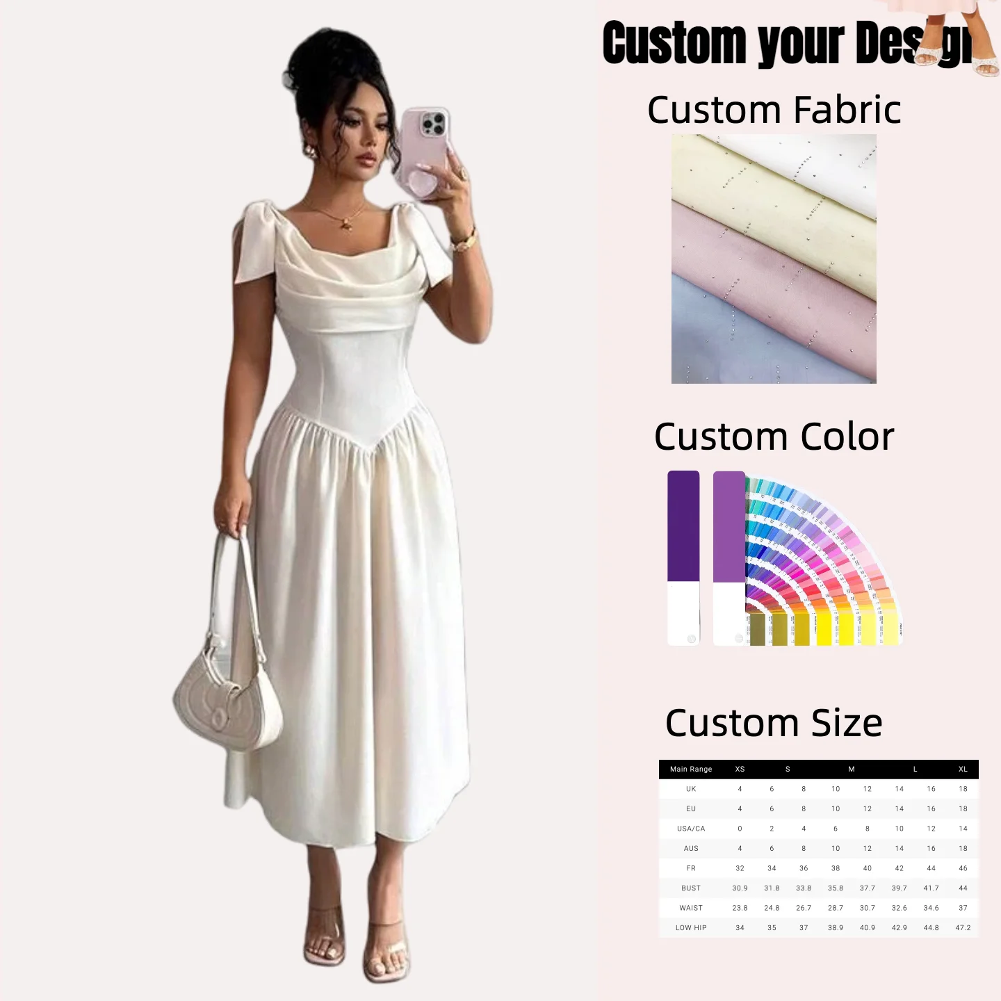 Women Casual Maxi Dress Breathable Shoulder Tie Detail Round Neck Pleated Front Design Empire Waistline for Summer Elegant Lady