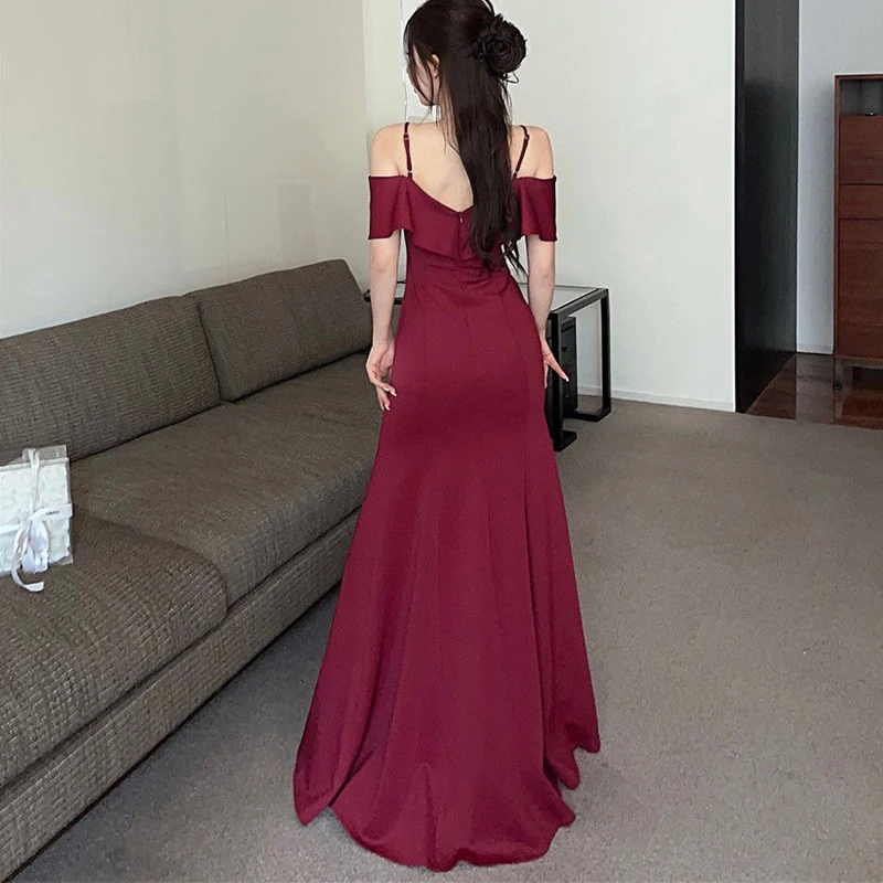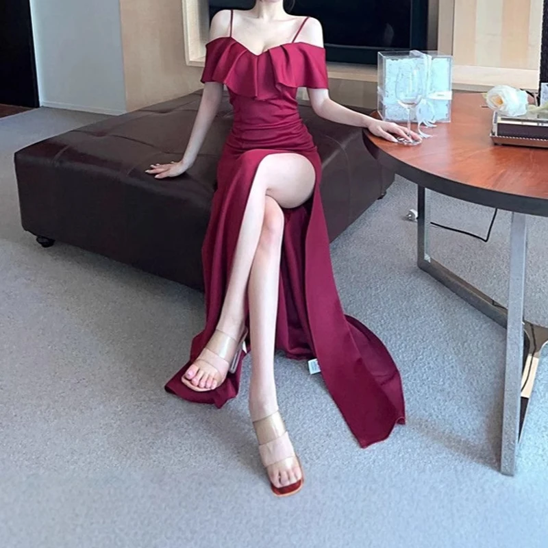 New Sexy Low-cut Tempting Slit Red Long Suspender Dress Backless High-waisted Evening Dress
