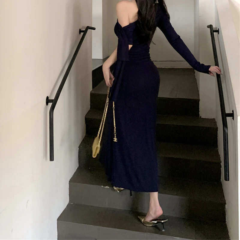 Women Slanted Shoulder Short-Sleeved Slim Fit Asymmetrical Skirt Pure Waist-Hugging Hip Long Floor-Length