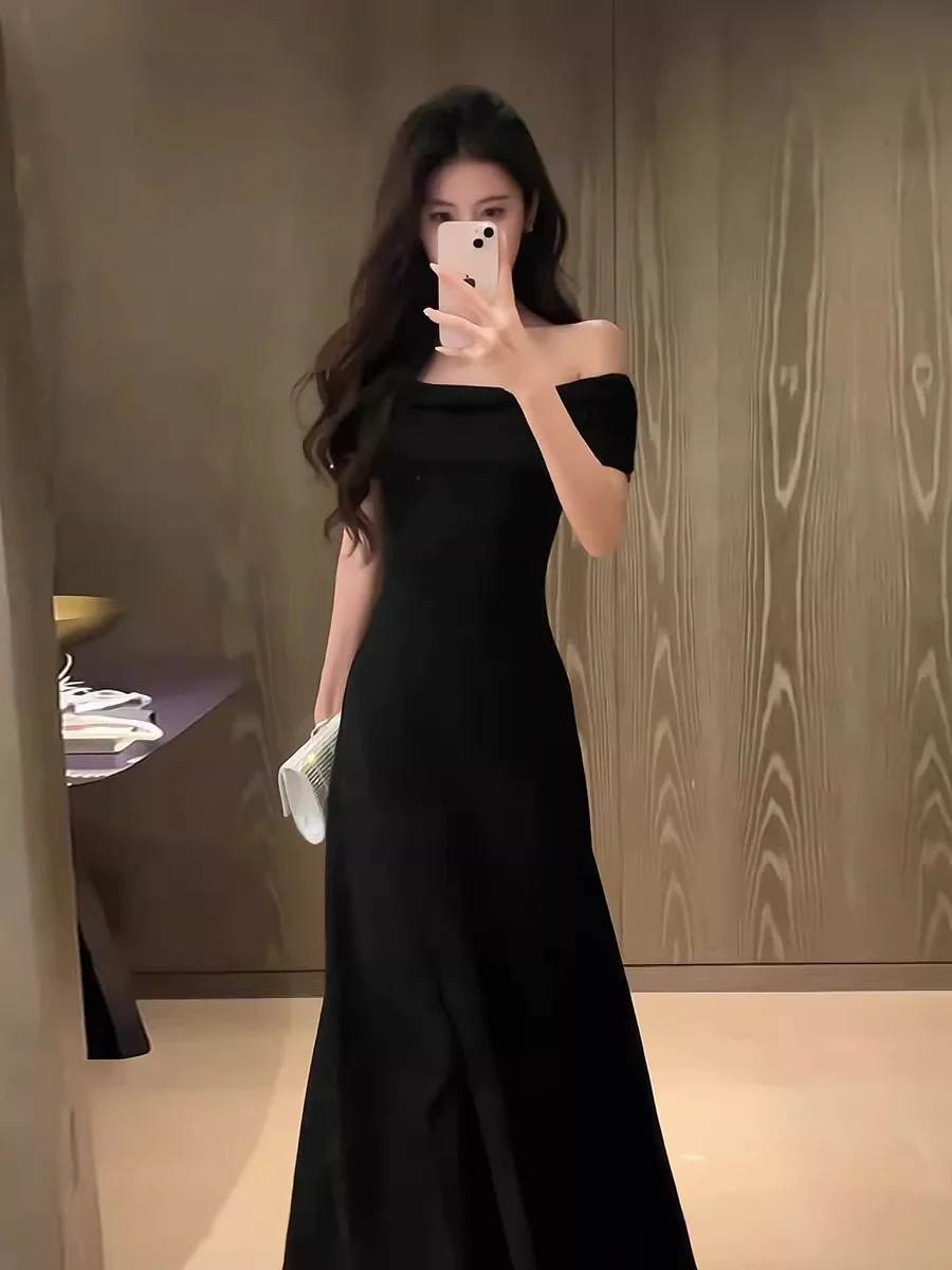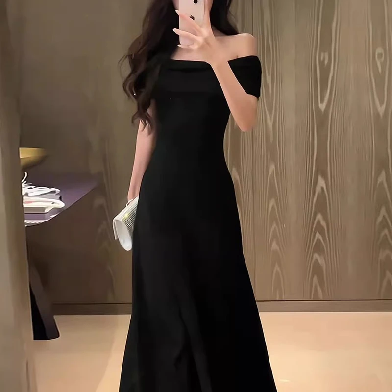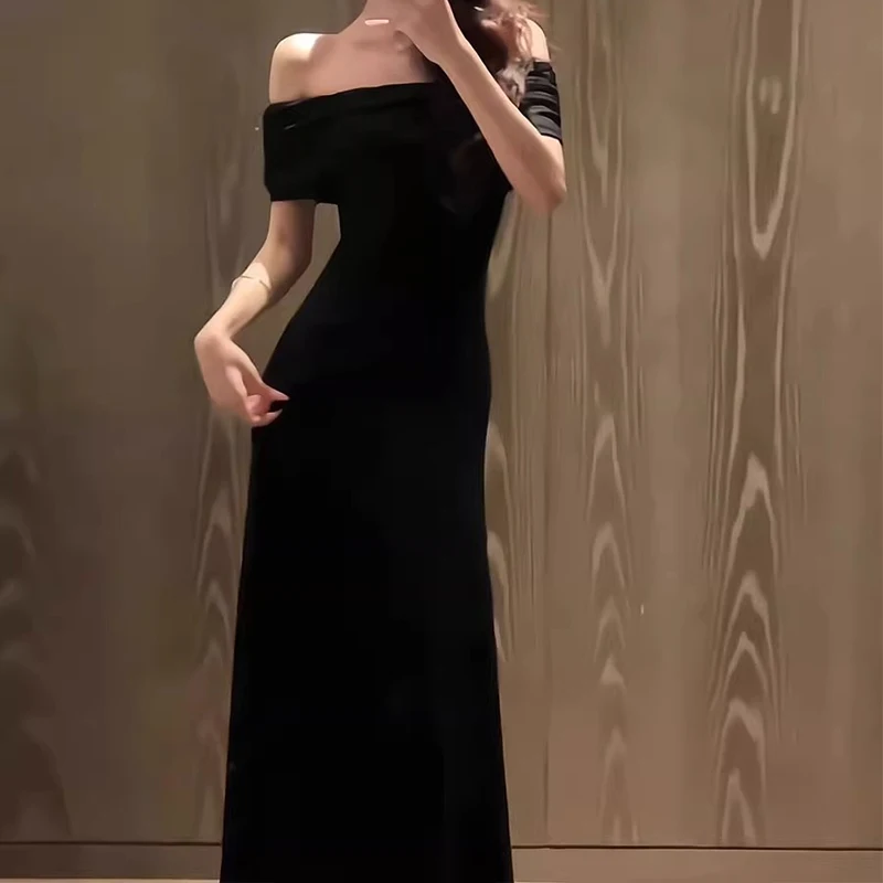 High-End French Chic Summer for Women Beautiful One-Shoulder Black Short-Sleeved Hip-Hugging Skirt Floor-Length Royal Sister