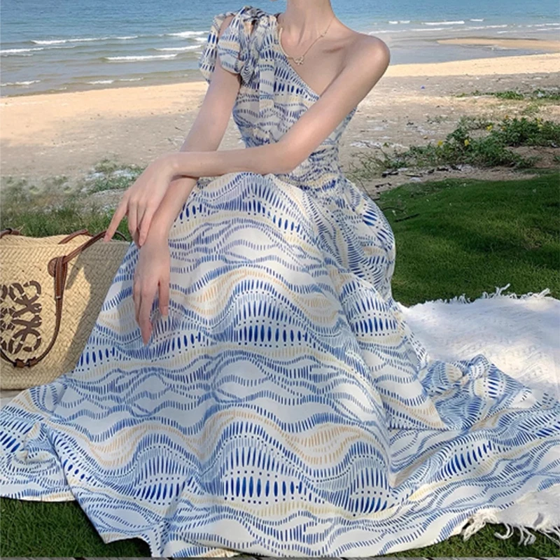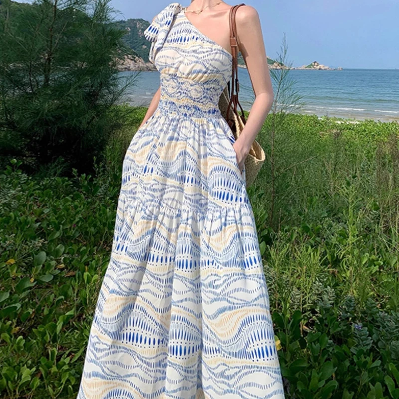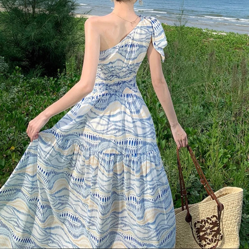 Wholesale 2026 Spring New High Quality and Elegant Style Slant Neck Off Shoulder Waist Slimming A-line Printed Women's Dress