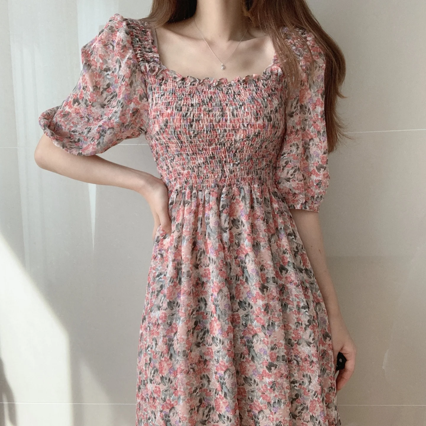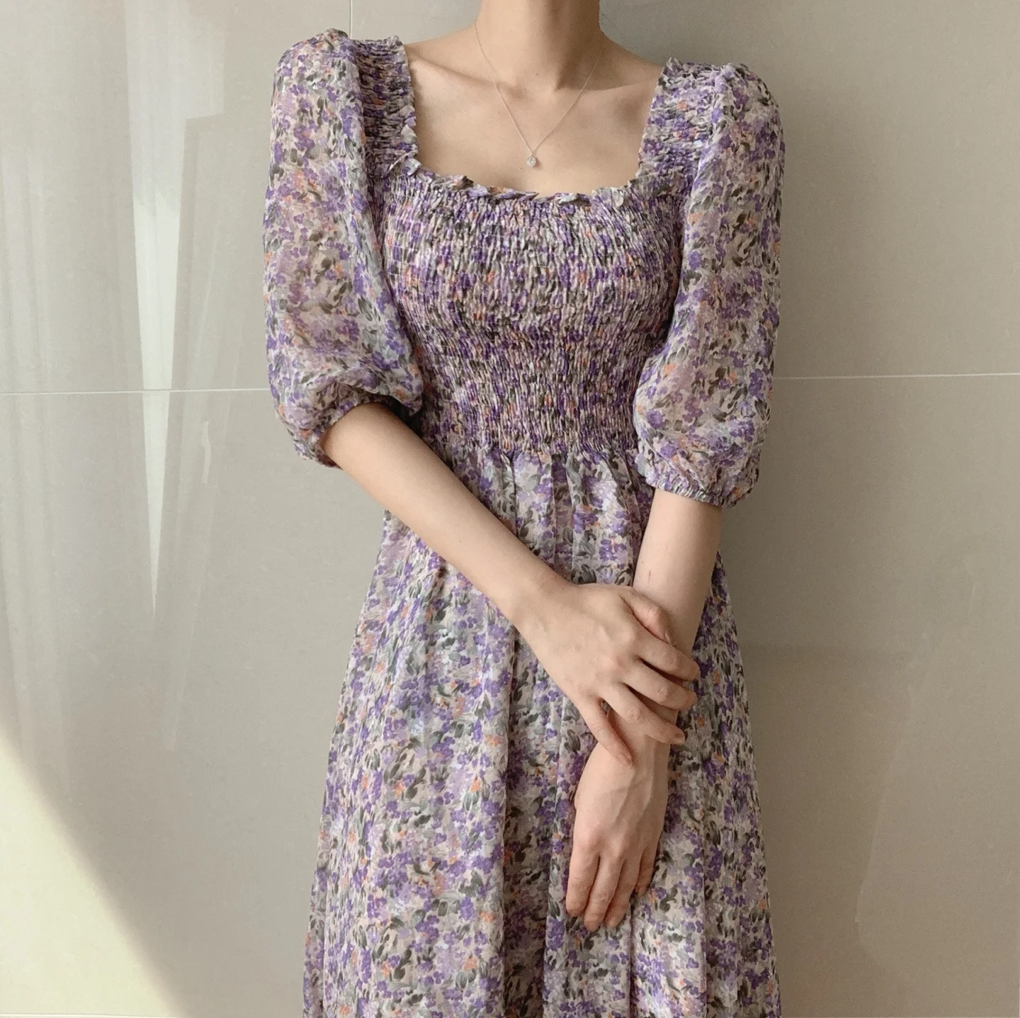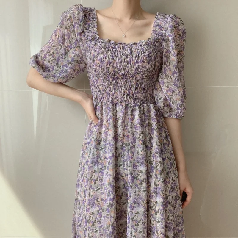 Square Collar Dress Puff Sleeve Women's Dresses Floral Printed Midi Dress