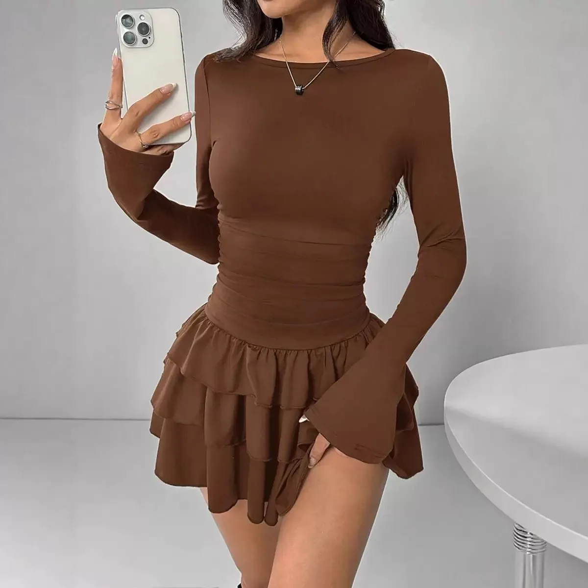 2026 Autumn Winter Collection Women's Fashion Long Sleeve Dress Ruffled Stitching European American Style Plain Dyed Independent