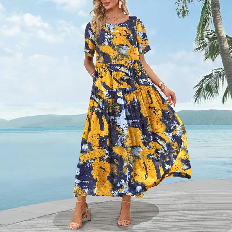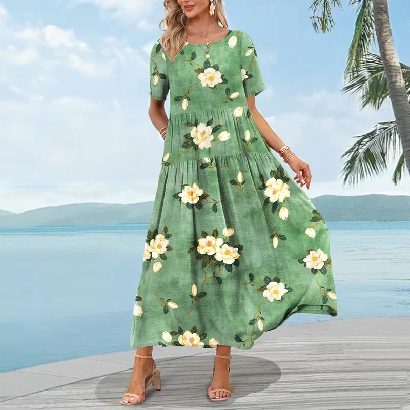 Women's Elegant Floral Print Bohemian Maxi Dress Summer Casual Empire Waist Long Beach Swing Sundresses Pockets Plus Size Belt