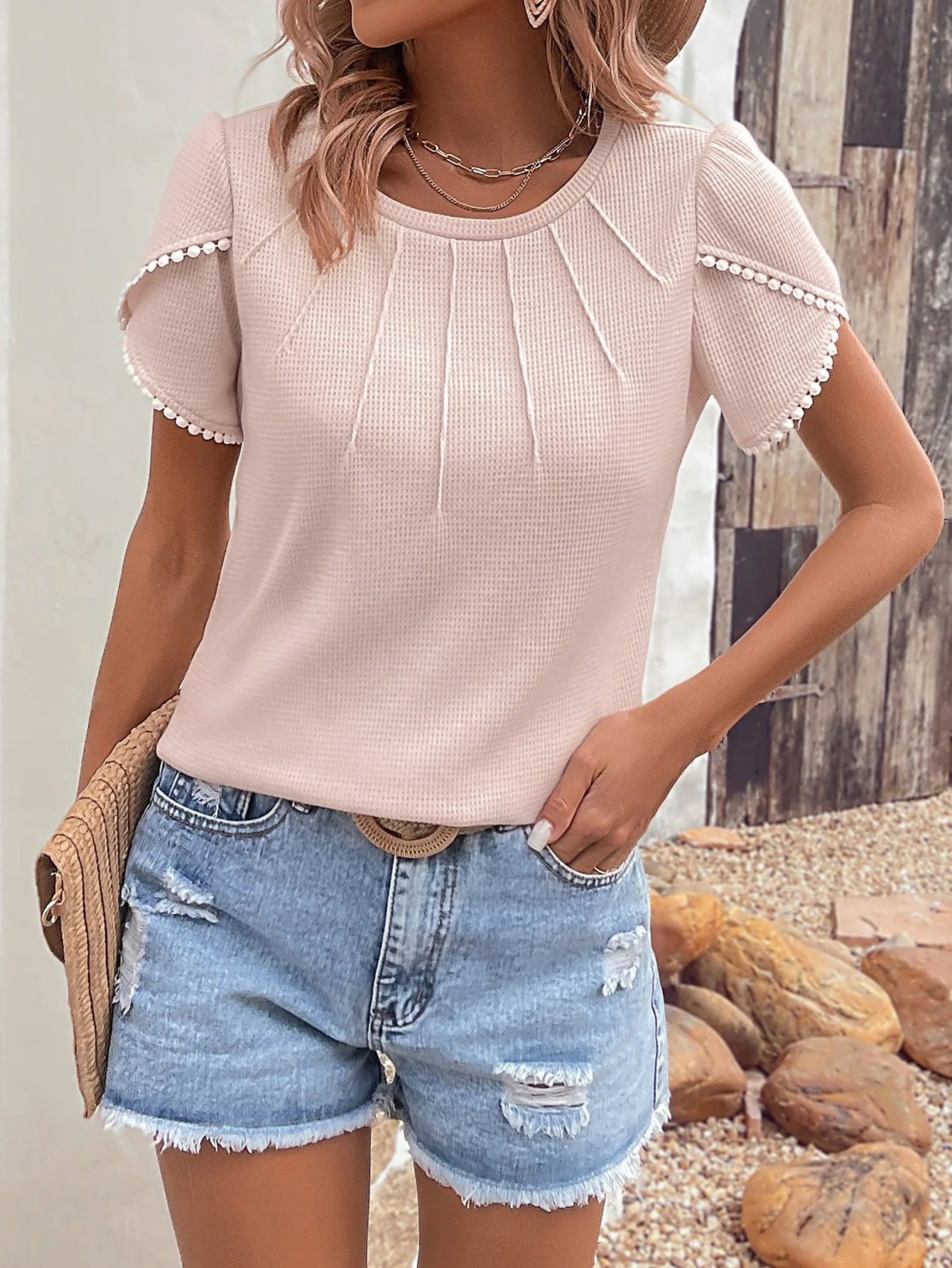 Custom Women's Solid Breathable Knitted Petal Short Sleeve Ruched T-shirt Summer Vintage Style Eco-Friendly Compressed Factory