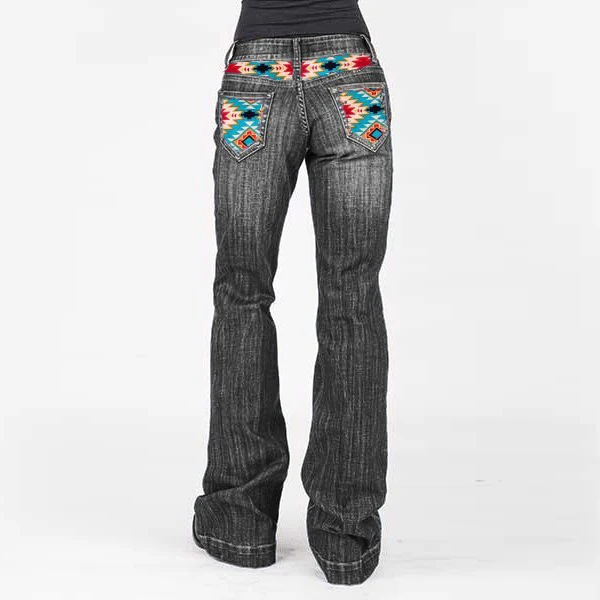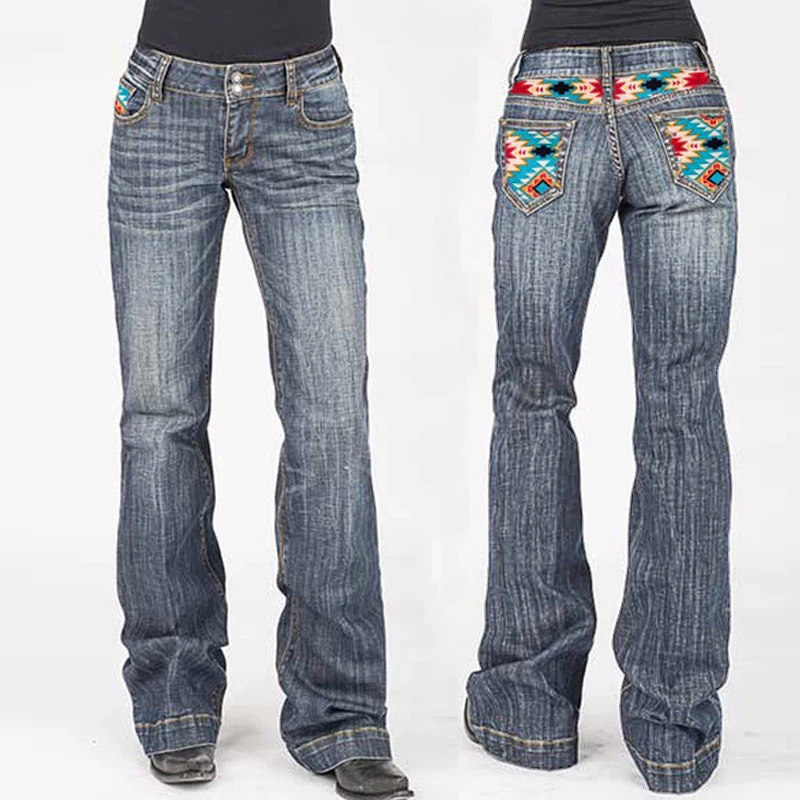 Cowgirl Stretch Bootcut Denim Outfit Super Comfort Tall Denim Bell Bottom Pants Middle Rise Pockets Printed Women Flare Jeans