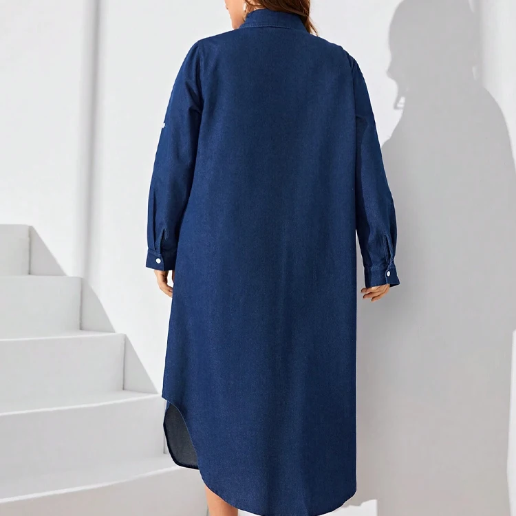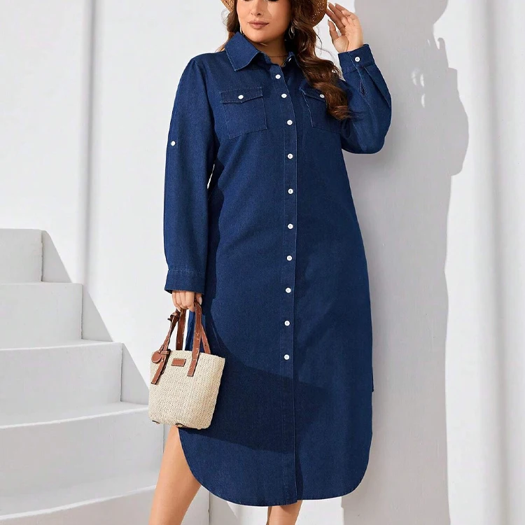 Casual Summer Midi Denim Overall Dress Plus Sizes Button Decorated Front Logo Long Sleeve Simple Fashion Element Washed Technics