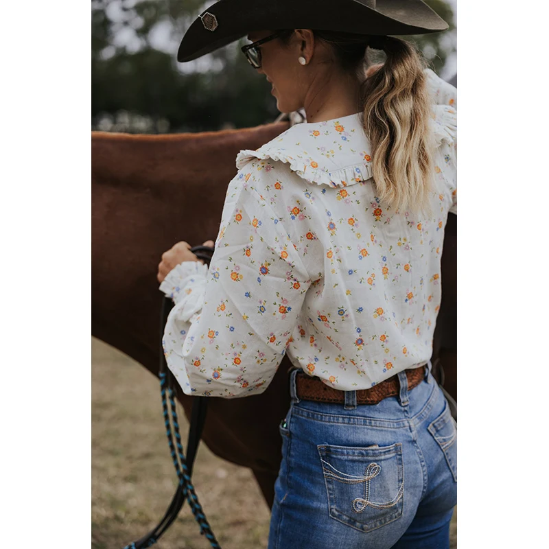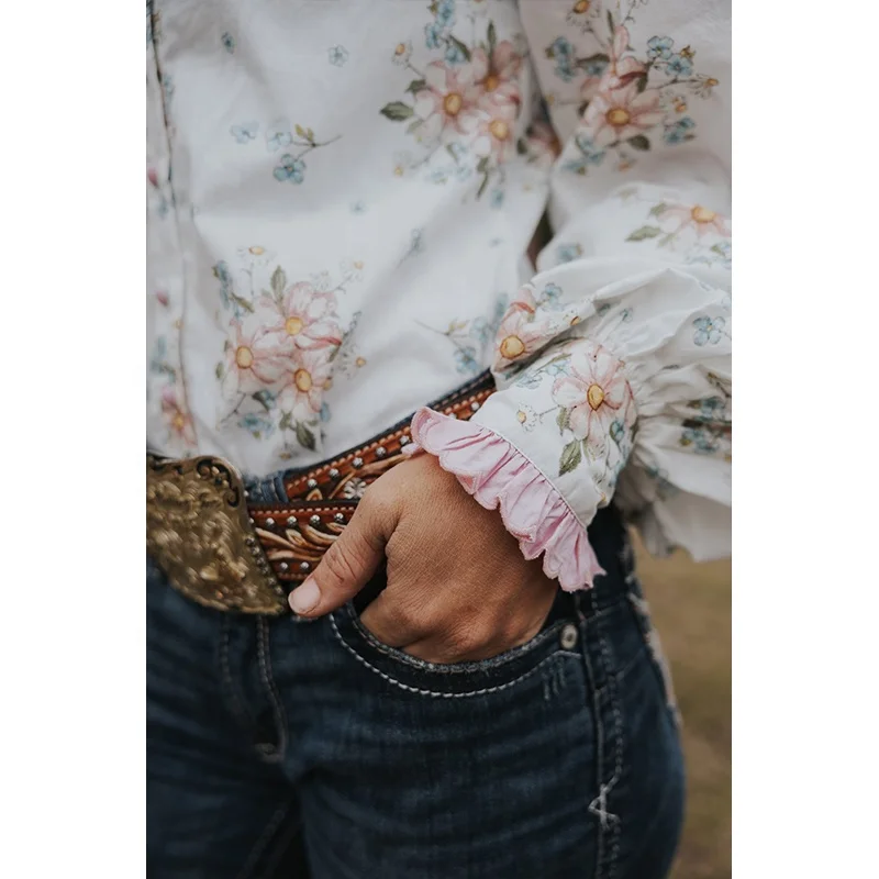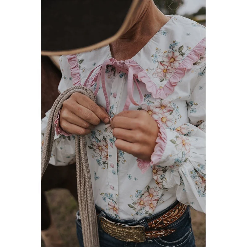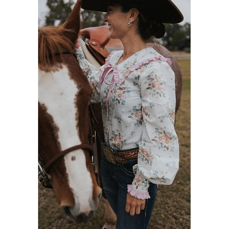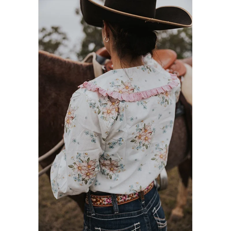 POXIAO manufacturer Women long sleeve full Button Australian 100%cotton floral printing vintage Western country arena Blouse