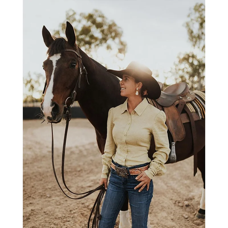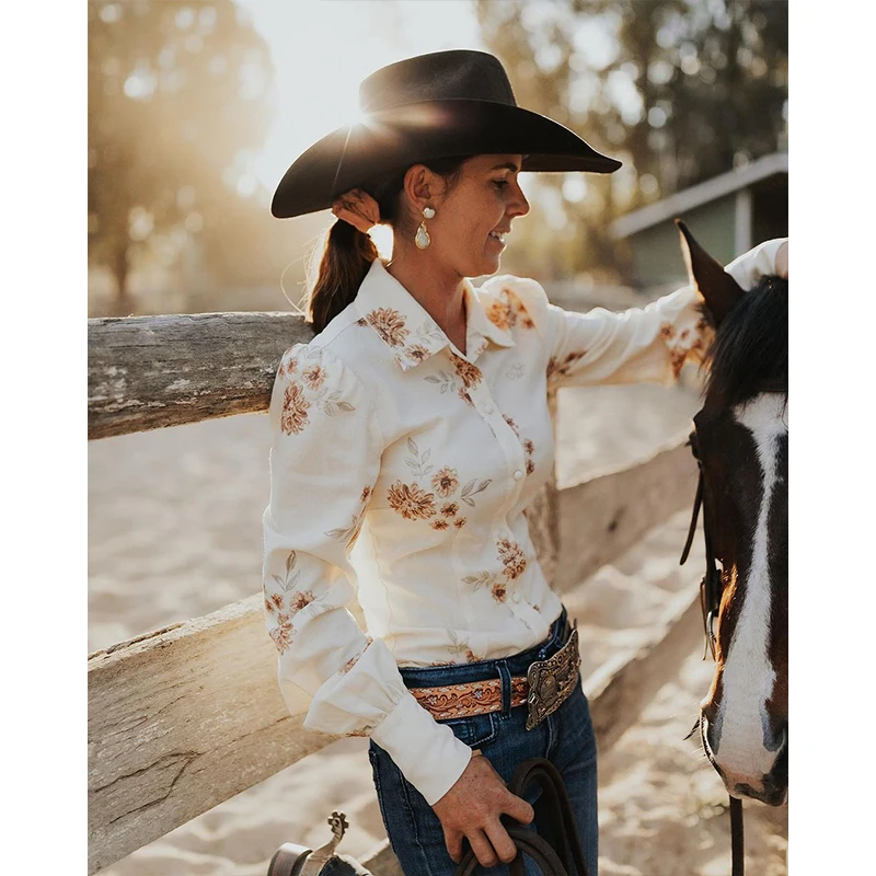 Women Arena Shirt linen cotton blend Floral Printing Long Sleeve Spring Breathable Ladies Linen Long Sleeve Western Arena Shirt